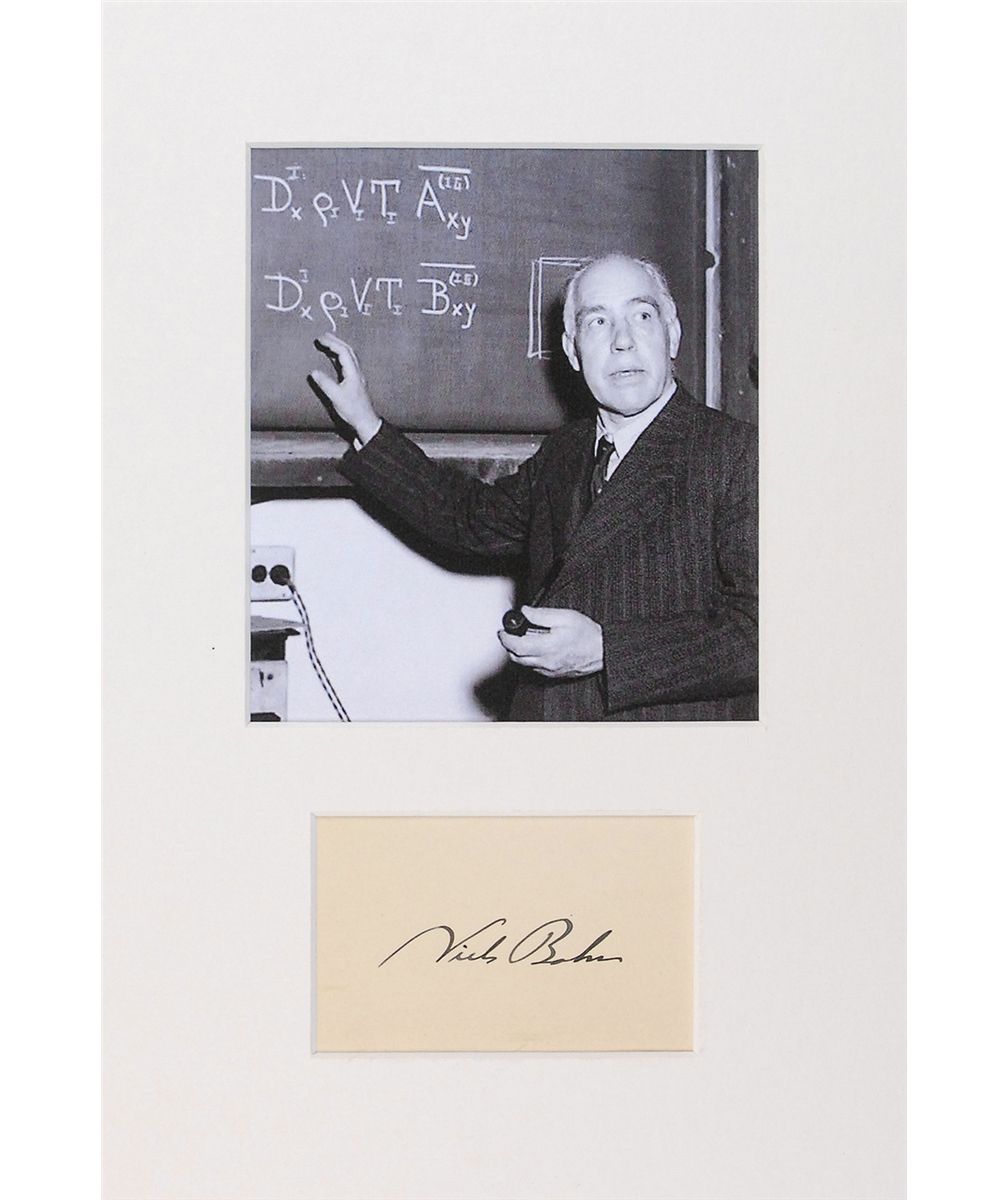 Danish physicist (1885–1962) who was awarded the 1922 Nobel Prize in Physics for his theory of atomic structure. Bold vintage ink signature, “Niels Bohr,” on an off-white 3.25 x 2 card. Matted with an image of Bohr to an overall size of 7.25 x 10.75. In fine condition.