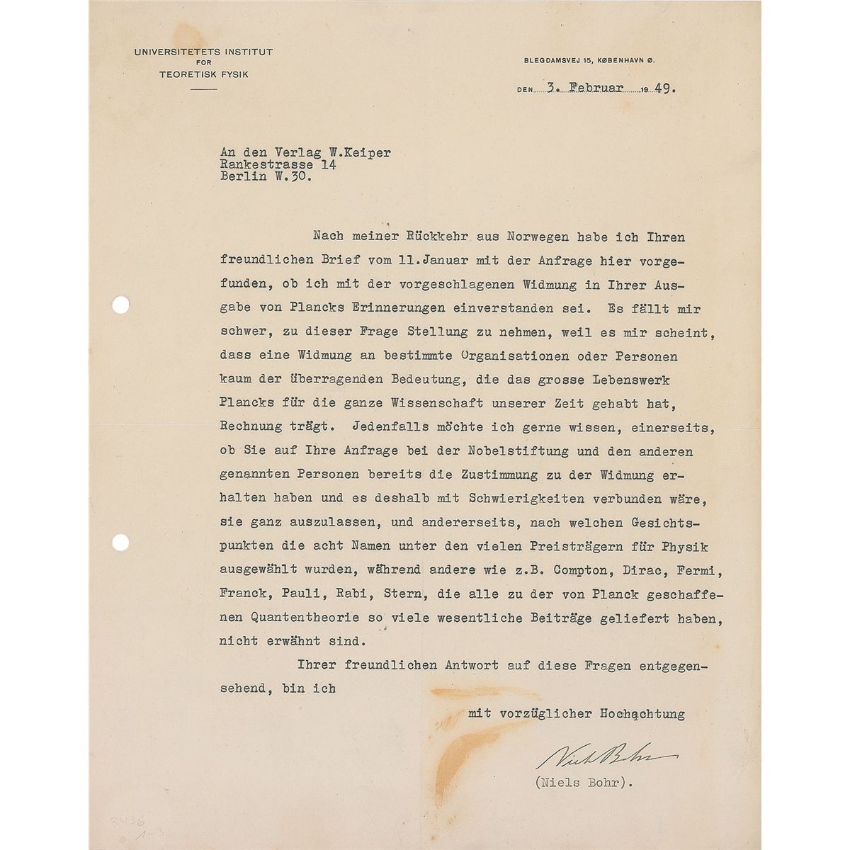 Danish physicist (1885–1962) who was awarded the 1922 Nobel Prize in Physics for his theory of atomic structure. TLS in German, one page, 8.75 x 11.25, Institut for Teoretisk Fysik letterhead, February 3, 1949. Letter to the publisher W. Keiper in Berlin. In part (translated): “I have your friendly letter asking if I was satisfied with the proposed dedication in your edition of Planck's recollections. It is hard for me to answer the question posed, because it seems to me that a dedication to certain organizations or persons hardly projects the paramount importance of Planck's life work to the science of our time. Anyway, I might like to know, on the one hand, if you have already received from the Nobel Foundation and other named persons the approval of the dedication and it would therefore be associated with difficulties…On the other hand, after the eight names among the many [Nobel] award-winners for Physics selected, you omit entirely others such as Compton, Dirac, Fermi, Franck, Pauli, Rabi, Stern, from whom so many significant contributions to the Planck quantum theory have come.” Intersecting folds, a few significant stains affecting the overall appearance, and punch holes to the left edge, otherwise fine condition. Fabulous content associating several of the most influential figures in the development of quantum theory.