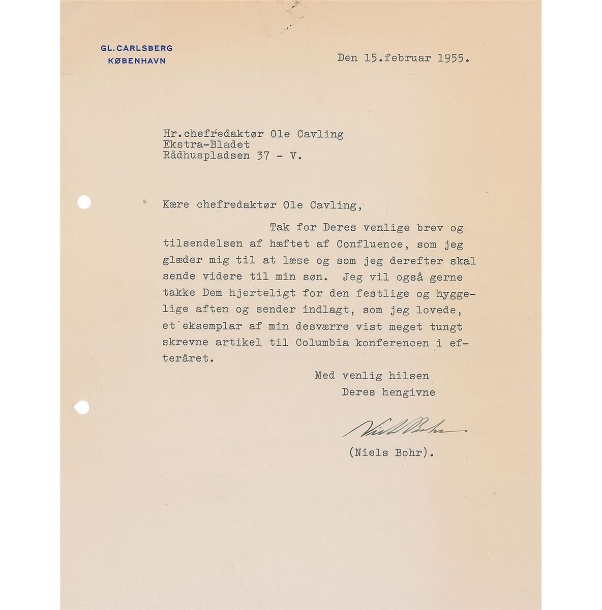 Danish physicist (1885–1962) who was awarded the 1922 Nobel Prize in Physics for his theory of atomic structure. TLS in Danish, one page, 7.25 x 9.25, personal letterhead, February 15, 1955. Letter to Ole Cavling, editor-in-chief of the newspaper Extra-Bladdet, thanking him for sending a copy of Confluence magazine. In part (translated): “I will be happy to read it and will give it afterwards to my son. I’m also sending the enclosed as promised, a copy of my unfortunately very detailed article for the Columbia Conference last fall.” Scattered creases, light toning, a paperclip mark to the top edge, and filing holes to the left edge, otherwise fine condition. Accompanied by the copy of the 20-page speech mentioned in the letter, entitled ‘Unity of Knowledge.’ Bohr delivered this speech at Columbia University on October 28, 1954, as a part of its 200th anniversary symposia, the theme of which was ‘Man’s Right to Knowledge and the Free Use Thereof.’ He was fascinated by the philosophical questions that rose from discoveries in quantum physics, and promoted the idea of an interdisciplinary conceptual approach to the expansion of human knowledge. A wonderful piece related to Bohr’s often overlooked contributions to philosophy.