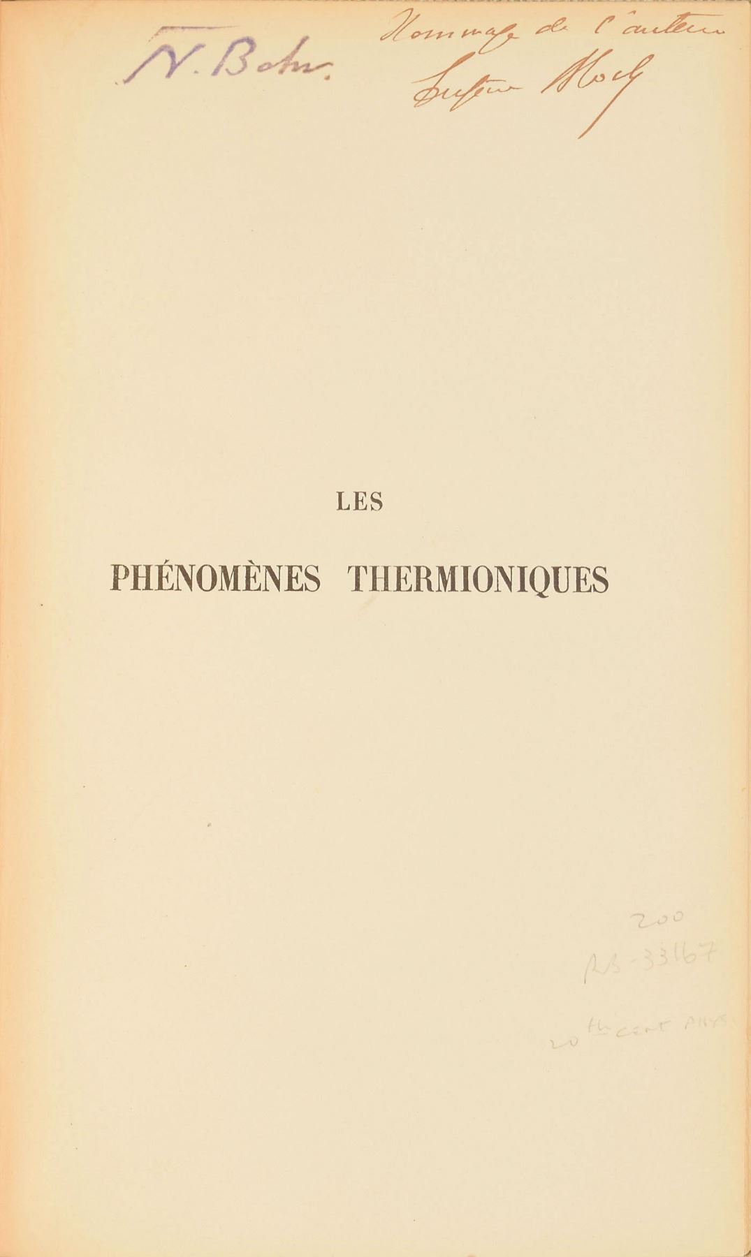 Signed book: Les Phenomenes Thermioniques by Eugene Bloch. First edition. Paris: Les Presses Universitaires de France, 1923. Hardcover, 6.25 x 9.5, 111 pages. Signed on the half-title page in fountain pen, "Hommage de l'author, Eugene Bloch." To the left of the inscription is a stamped facsimile signature of Bohr, indicating that the volume originates from his personal library. Autographic condition: fine. Book condition: VG/None, with sunning to spine. Eugene Bloch (1878–1944) was a French physicist and professor at the Ecole Normale Supérieure, and at the Faculty of Science of the University of Paris.