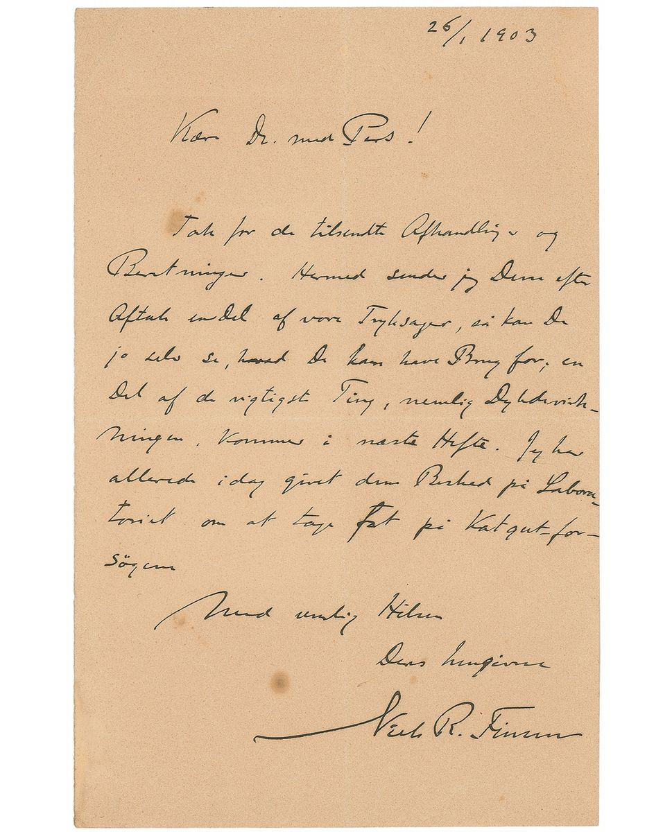 Physician and scientist (1860–1904) awarded the Nobel Prize in Medicine and Physiology in 1903, best known for his pioneering use of phototherapy for treatment. ALS in Danish, signed “Niels R. Finsen,” one page, 5.25 x 8, January 26, 1903. Letter to a physician discussing an upcoming experiment with catgut in the laboratory. In fine condition, with a few small stains. Catgut, the the natural fiber found in the walls of animal intestines (generally sheep), was a widely used material in surgical settings for the suturing of wounds. An extremely scarce letter with desirable medical content.