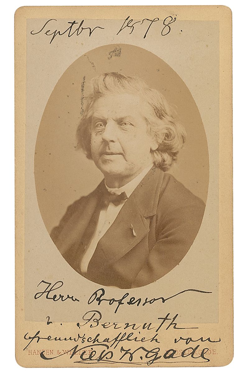 Eminent Danish composer and conductor (1817–1890). Original 2.5 x 4 carte-de-visite bust portrait of Gade, boldly signed and inscribed in German at the bottom in black ink to Professor Bernuth and dated September 1878. Published by Hansen & Weller of Copenhagen. In fine condition.
