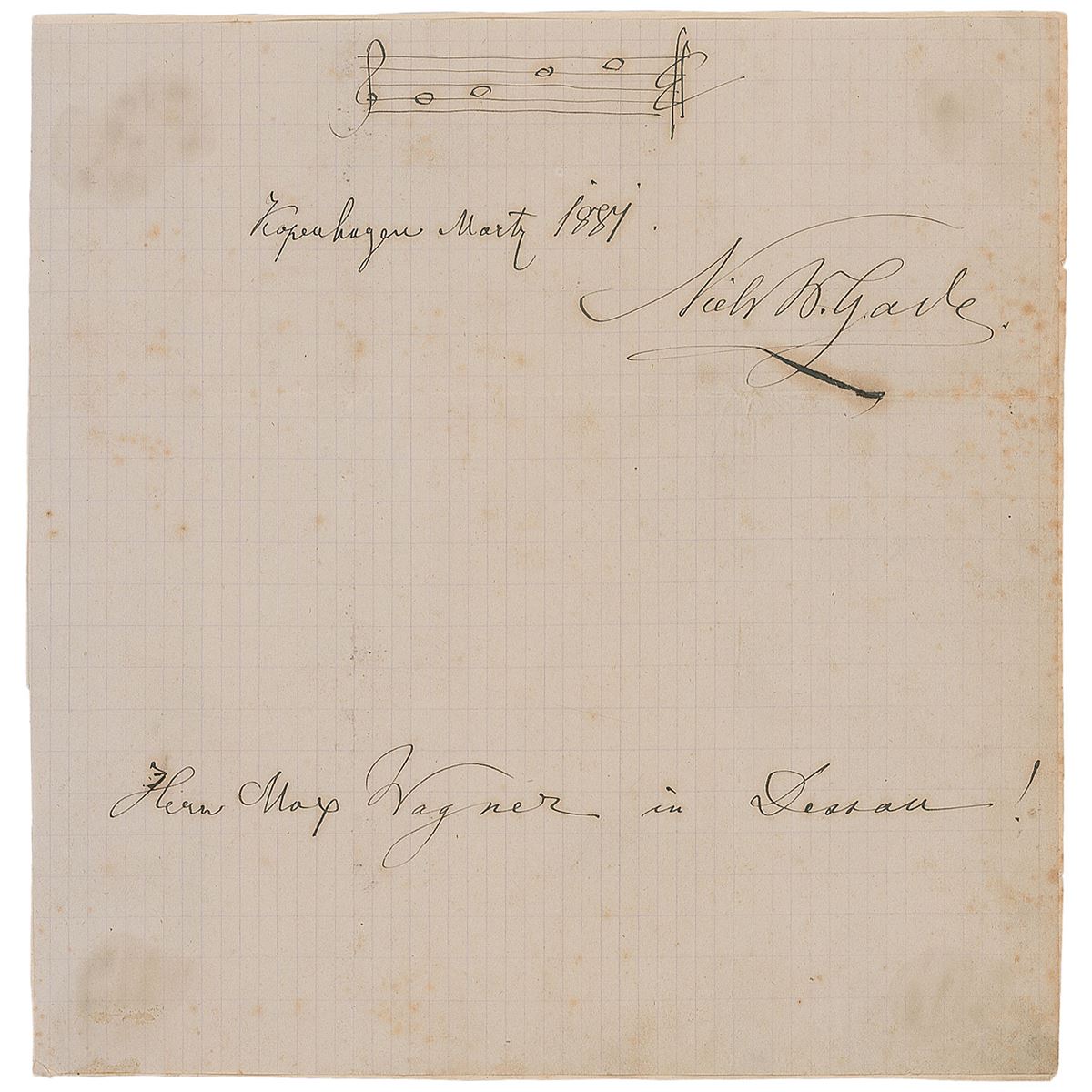 Eminent Danish composer and conductor (1817–1890). AMQS on a lightly gridded off-white 8.5 x 8.5 sheet, signed below in black ink, “Copenhagen, Martz 1887, Niels W. Gade,” adding an inscription at the bottom, “Herr Max Wagner in Dassau!” Gade pens a series of whole notes: G, A, D, and E. Affixed to a slightly larger sheet. In very good condition, with partial separations to intersecting folds, and scattered soiling and foxing. Gade is rare in any form, and especially sought-after in AMQSs.