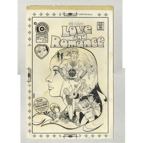<B>Nieto (attributed) - Love and Romance #20 Cover Original Art (Charlton, 1974).</B></I> Charlton artist "Nieto" specialized in romance covers of a mildly "kinky" nature. Nothing offensive, just a bit <I>outre</B></I>. A buff pretty-boy frolics in the imagination of a young girl -- making for a striking a cover montage! The image area of this cover measures 12.5" x 19". This cover was collaged together from four separate elements, and there is some mild glue staining; otherwise, the art is in Very Good condition. A vellum overlay with color pencil, that was used as the color guide, is also included in this lot.