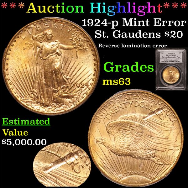 ***Auction Highlight*** MINT ERROR 1924-p Gold St. Gaudens Double Eagle $20 Graded ms63 by PCGS (fc)
