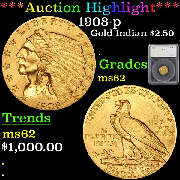 ***Auction Highlight*** 1908-p Gold Indian 2.5 Graded ms62 by SEGS (fc)
