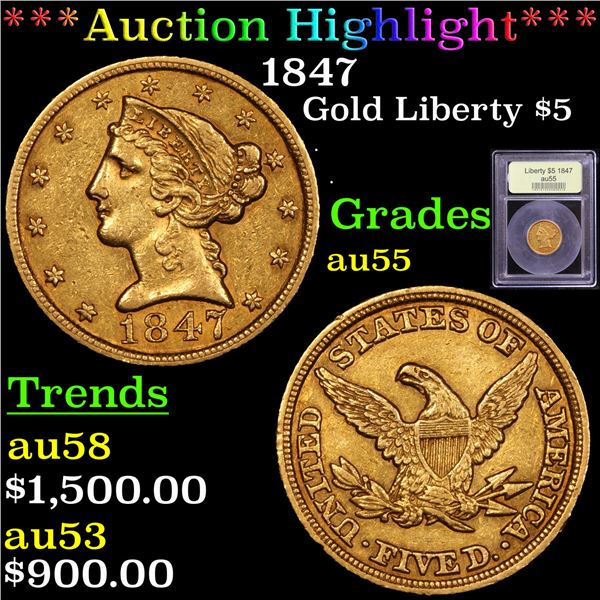***Auction Highlight*** 1847 Liberty Head Gold 5 Graded Choice AU by USCG.