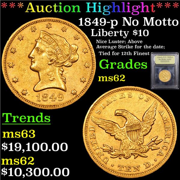 ***Auction Highlight*** 1849-p No Motto Gold Liberty Eagle $10 Graded Select Unc by USCG. Scarce Uncirculated No Motto 1849 $10 Gold Eagle. Ni