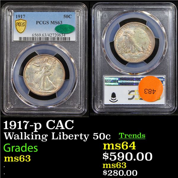 PCGS 1917-p Walking Liberty Half Dollar CAC 50c Graded ms63 by PCGS