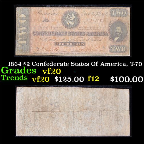 1864 $2 Confederate States Of America, T-70 Grades vf, very fine. This $2 paper note not only marks the last of its denomination it also was fr