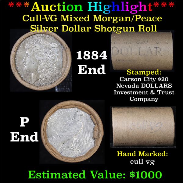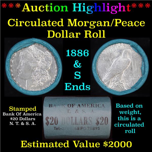 ***Auction Highlight*** Full solid Bank Of America Morgan/Peace silver dollar roll, 20 coin 1886 & '