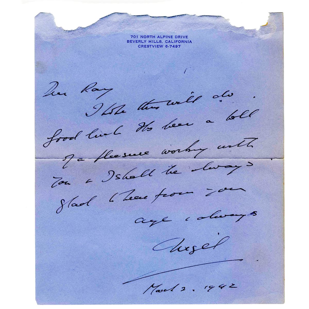 Nigel Bruce autograph letter signed. Composed on personal stationery and dated 2 March 1942, Bruce writes during the production of three Sherlock Holmes features for Universal. In part: ''Dear Ray / I hope this will do. Good luck Its been a hell of a pleasure working with you & I shall be always glad I heard from you…'' Signed ''Nigel.'' Measures 6'' x 7''; 1p. Paper loss to top edge, not affecting text or signature. Toning to folds and edges, else very good condition.