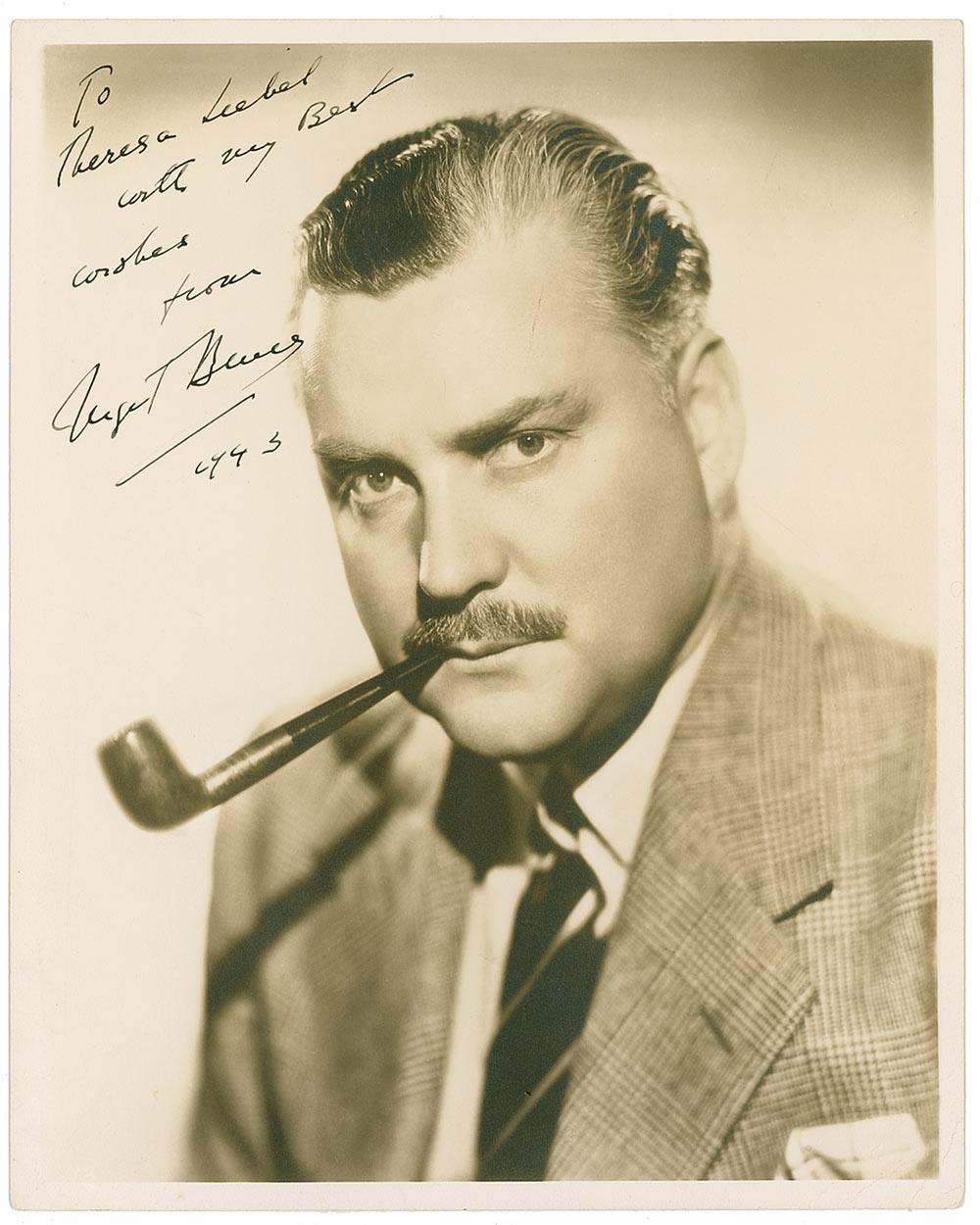 British character actor (1895–1953) best known for his frequent role as Dr. Watson opposite Basil Rathbone as Sherlock Holmes. Vintage matte-finish 8 x 10 photo of Bruce with a pipe clenched in his teeth, signed and inscribed in fountain pen “To Theresa Liebel, with very best wishes from Nigel Bruce 1945.” In fine condition, with light creases to lower right corner, and a bit of scattered light silvering to darker areas. A splendid example signed in the year of three Sherlock Holmes film releases including Sherlock Holmes and the House of Fear.