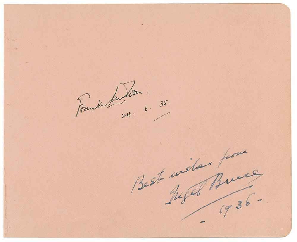 Vintage fountain pen signature, “Best wishes from Nigel Bruce, 1936,” on a light pink 6.5 x 5.25 album page, with another unknown signature on page (which could easily be matted out. In fine condition, with a bit of trivial edge soiling and a few slight wrinkles.