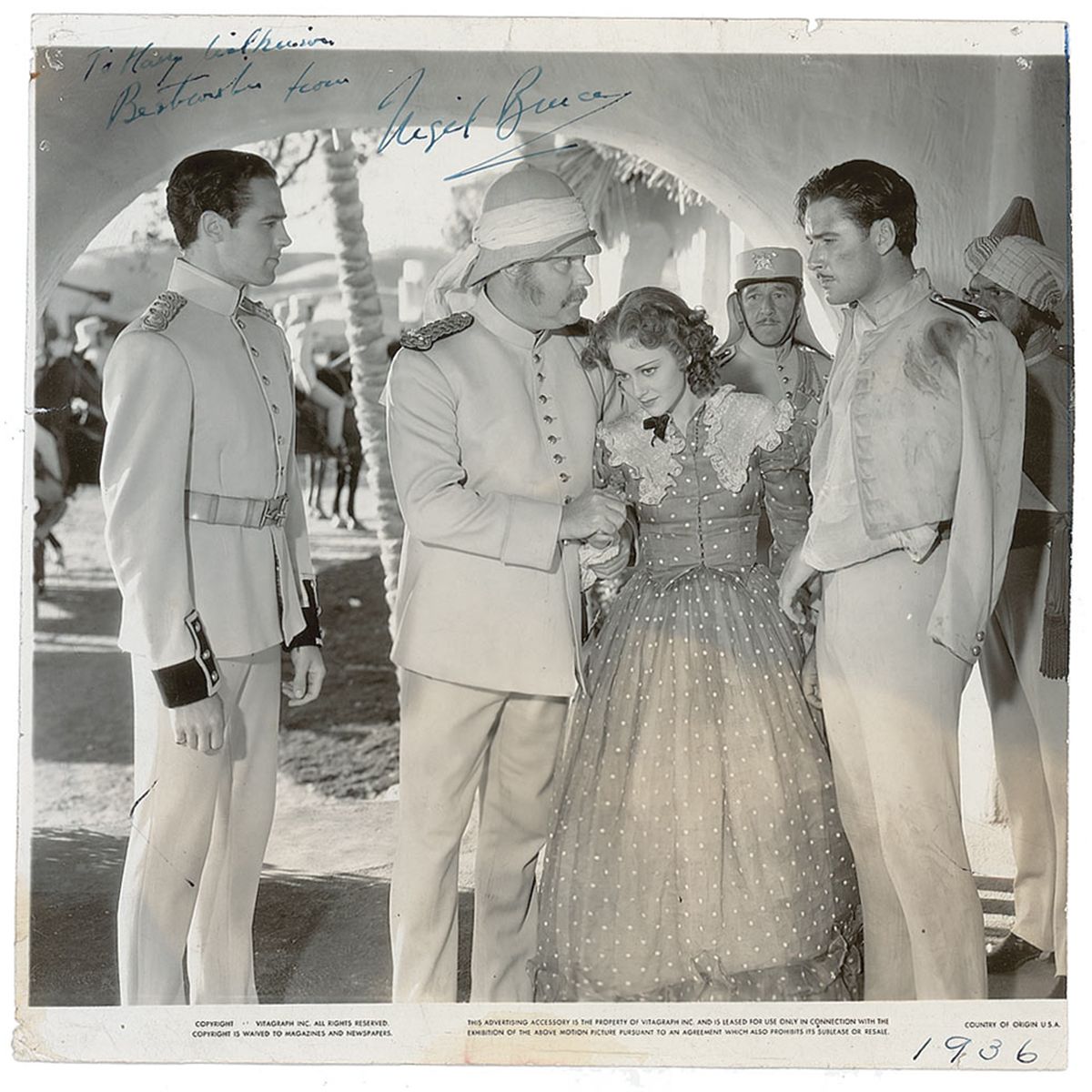 Vintage glossy 8 x 8 publicity photo of Bruce, Errol Flynn, and Olivia de Havilland from Charge of the Light Brigade, signed and inscribed in fountain pen, “To Harry Wilkinson, Best wishes from Nigel Bruce.” Scattered surface creasing, marks, and toning, light discoloration to the bottom edge, a tear to the left edge, tack holes to the corners, trimmed edges, and the year 1936 penned in the bottom border in another hand, otherwise very good condition. Stamp on reverse indicates photo came from Harry Wilkinson’s “Hollywood Amuseum of Memories,” Marblehead, Massachusetts.