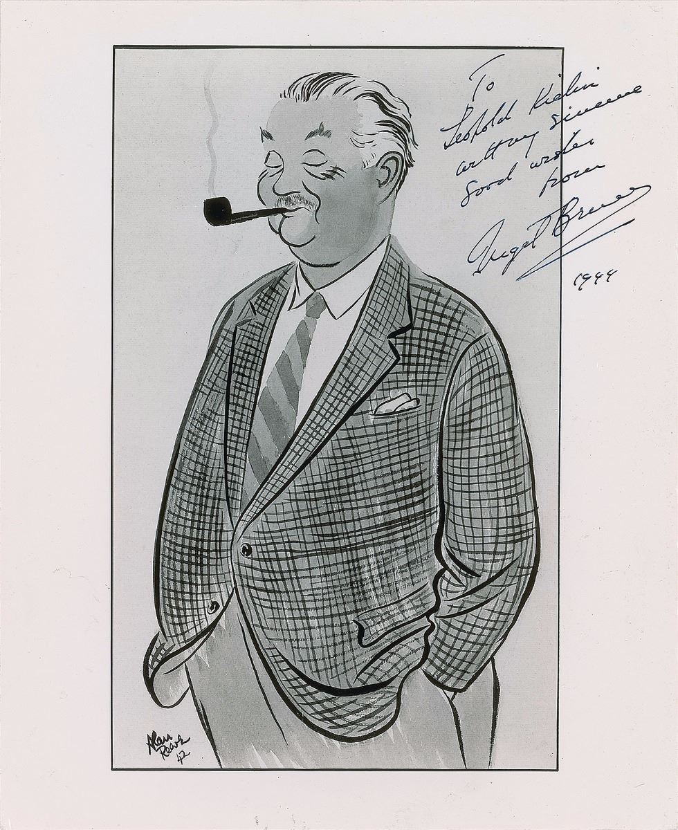 Glossy 8.25 x 10 photo of an Alan Reeve caricature of Bruce as a pipe-smoking Dr. Watson, signed and inscribed in black ink, “To Leopold Kielin, with my sincere good wishes, from Nigel Bruce, 1944.” In fine condition. A delightful and uncommonly sized image of the British actor in his identifiable role.
