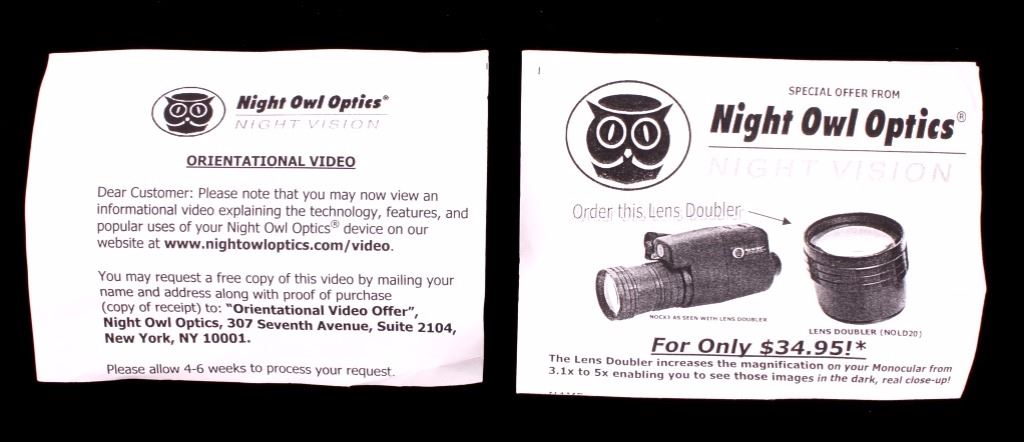 This is a night vision scope made by Night Owl Optics. The scope has built in infrared. It uses (2) AA batteries. Included with the scope is a soft case. The night vision scope is in good condition. It measures 2.25" x 3" x 7".