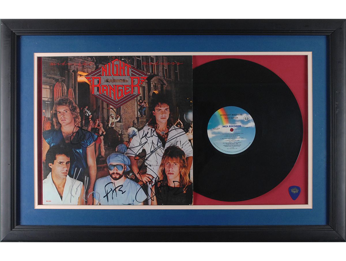 Midnight Madness album signed on the front cover in black felt tip and silver ink by Jack Blades, Jeff Watson, Brad Gillis, Alan Fitzgerald, and Kelly Keagy. Double-matted and framed with a Night Ranger guitar pick to an overall size of 28.25 x 18. In fine condition. The record is included. Oversized.