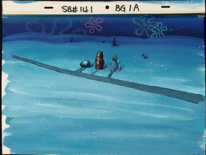 This original hand-painted background from the Nickelodeon TV show SpongeBob Squarepants. The story takes place under the deep blue sea in Bikini Bottom, where SpongeBob resides. SpongeBob, who is a yellow, porous sponge, is your typical happy-go-lucky character, as he is always cheerful and enjoys making people laugh. Patrick Star, SpongeBob's neighbor who is a starfish, is your average children's show idiot, as he boasts knowing nothing and is often getting himself into ridiculous situations. Between the homes of these two lies the home of the miserable Squidward, a squid, who is known for being grouchy and playing tricks on SpongeBob and Patrick. Both SpongeBob and Squidward work at the Krusty Krab, a fast food business run by the greedy money-loving Mr. Krabs, a crab, the arch rival of the evil, possibly misunderstood, Plankton. Another neighbor, Sandy Cheeks, an athletic squirrel who normally wears an astronaut's space suit, was introduced in "Tea at the Treedome." She spends most of her time inventing and experimenting. It's night time in Bikini Bottom.Original Production Background Overall Size of Background: 10 1/2" x 13 3/4" Very good conditionOriginal Production Backgrounds are used in the making of the final version of animated productions. The background establishes the location and the overall good mood of the scenee. Typically, a background layout artist creates a drawing to establish the content of the scene, placement of characters, perspective and camera angle. Based on this drawing, the background artist creates a preliminary painting to confirm all of the scenes details, then the final production background which is used in the filming of the scene. When these backgrounds are individually photographed behind the progression of production cels, and projected at a rapid succession, the images in the foreground appear to move, creating an animated scene. The background is ready to be matted and framed. It is a colored background with the animator's notations at the top. The notations have been taped to the background