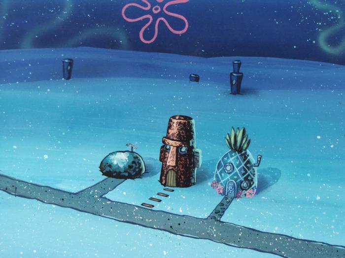 This original hand-painted background from the Nickelodeon TV show SpongeBob Squarepants. The story takes place under the deep blue sea in Bikini Bottom, where SpongeBob resides. SpongeBob, who is a yellow, porous sponge, is your typical happy-go-lucky character, as he is always cheerful and enjoys making people laugh. Patrick Star, SpongeBob's neighbor who is a starfish, is your average children's show idiot, as he boasts knowing nothing and is often getting himself into ridiculous situations. Between the homes of these two lies the home of the miserable Squidward, a squid, who is known for being grouchy and playing tricks on SpongeBob and Patrick. Both SpongeBob and Squidward work at the Krusty Krab, a fast food business run by the greedy money-loving Mr. Krabs, a crab, the arch rival of the evil, possibly misunderstood, Plankton. Another neighbor, Sandy Cheeks, an athletic squirrel who normally wears an astronaut's space suit, was introduced in "Tea at the Treedome." She spends most of her time inventing and experimenting. It's night time in Bikini Bottom.Original Production Background Overall Size of Background: 10 1/2" x 13 3/4" Very good conditionOriginal Production Backgrounds are used in the making of the final version of animated productions. The background establishes the location and the overall good mood of the scenee. Typically, a background layout artist creates a drawing to establish the content of the scene, placement of characters, perspective and camera angle. Based on this drawing, the background artist creates a preliminary painting to confirm all of the scenes details, then the final production background which is used in the filming of the scene. When these backgrounds are individually photographed behind the progression of production cels, and projected at a rapid succession, the images in the foreground appear to move, creating an animated scene. The background is ready to be matted and framed. It is a colored background with the animator's notations at the top. The notations have been taped to the background