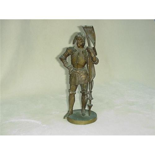 Antique bronze figure, modeled as a night in armor, 14" tall, base 4 1/2" in diameter. The 19th century figure originally did have a base, most likely marble, that is now missing. There is a bit of damage, the figure may have fallen over and landed on the lance, breaking off the tip and bending it. There was also a small finial on his helmet that is missing. He is also pretty dirty, but a handsome and antique bronze statute nonetheless. (7)