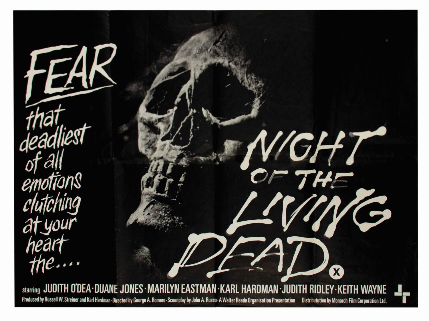 (Continental, 1968) An original British quad poster for the initial UK release of George Romero's Night of the Living Dead. With its stark and iconic decomposing skull imagery, this quad remains the most sought-after poster from the film's first run. Folded as issued, the piece measures 30"x40" and is in fine condition. There is some adhesive residue to the upper right corner of the reverse and in "O'Dea" on the front, corner creasing, three spots of surface loss in the top right quarter and one in the lower portion of the skull that have been filled in with black ink, adhesive residue and unobtrusive surface loss in the "X" rating where a paste-up was removed, and minor fold and edge wear.