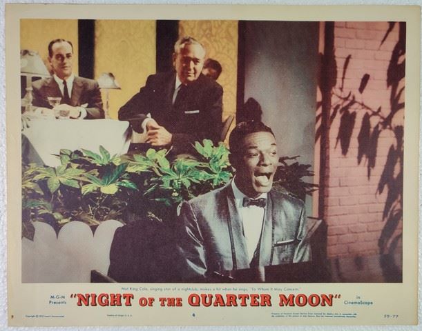 Night of the Quarter Moon (Albert Zugsmith, 1959) lobby card. Drama. Starring Julie London, John Drew Barrymore, Anna Kashfi, Dean Jones, Agnes Moorehead, Nat 'King' Cole, Ray Anthony, Jackie Coogan, Charles Chaplin Jr., Billy Daniels, Cathy Crosby, James Edwards, Arthur Shields, Edward Andrews. Directed by Hugo Haas. Very light edge wear, very light creases, small tear. Excellent. (11"x14").