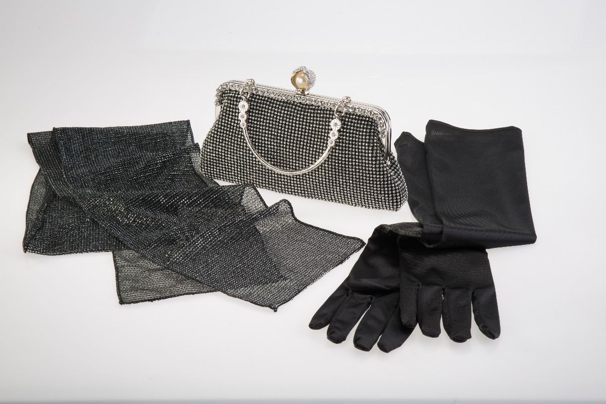 Make your evening on the town glitter with this rhinestone studded bag, shimmery scarf and opera-length gloves. Dramatic, classic and fun for that special night!