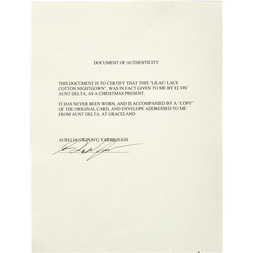 <B>Elvis Related -- Nightgown Gift From Aunt Delta.</B></I> It's a down home Christmas with the Presley family! Here's a lilac lace-cotton nightgown given by Elvis Presley's Aunt Delta as a Christmas gift to Aurelia Dupont. Also included is a photocopy of the Christmas card sent with it. Never worn, and in Excellent condition. <I>From the Aurelia Dupont Collection</B></I>.<BR><BR><b>Shipping:</b> Clothing, Costumes & Jerseys (<a target="_blank" href="http://www.heritageauctions.com/common/shipping.php">view shipping information</a>)