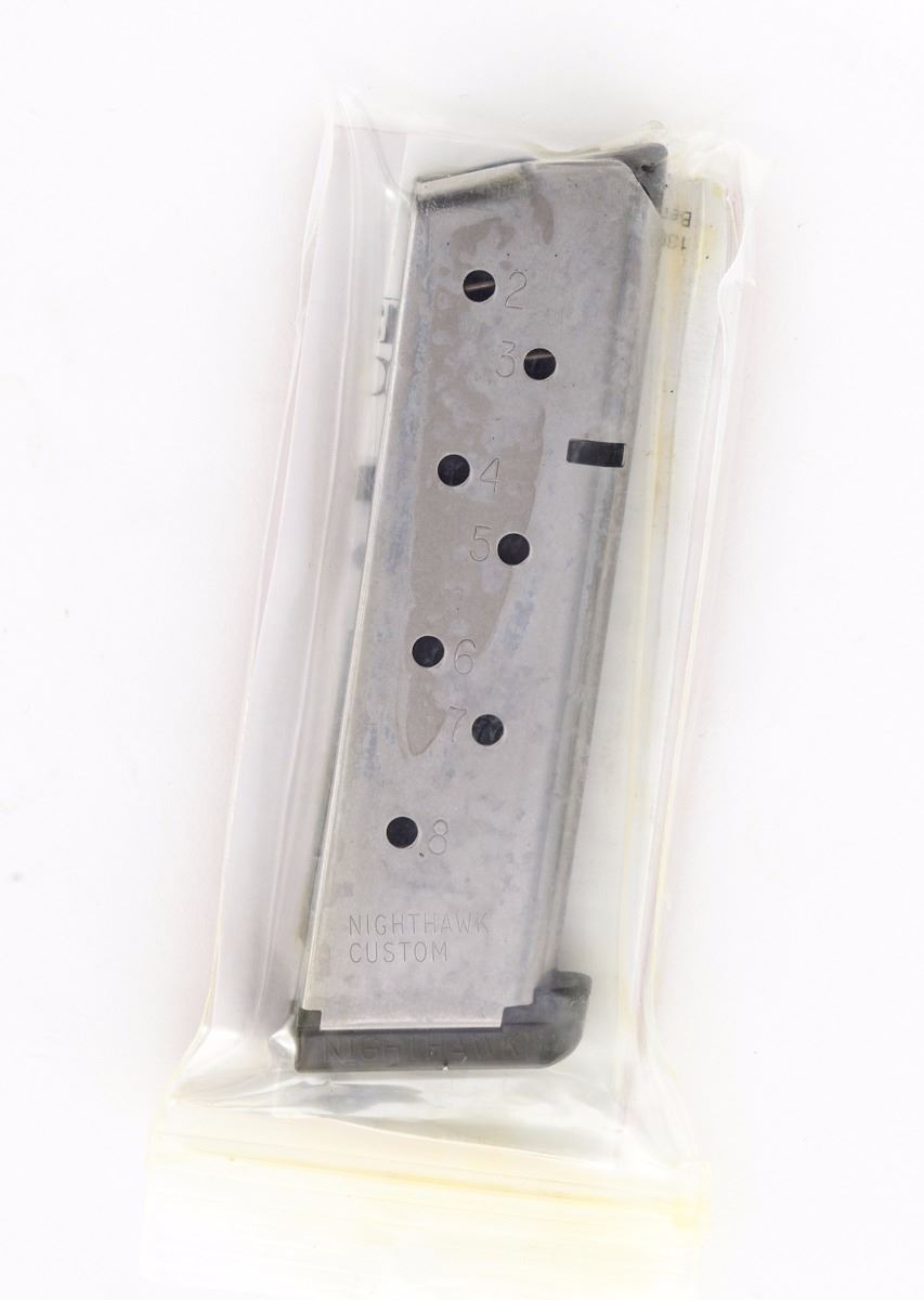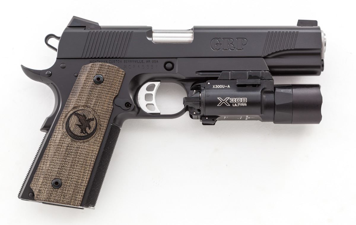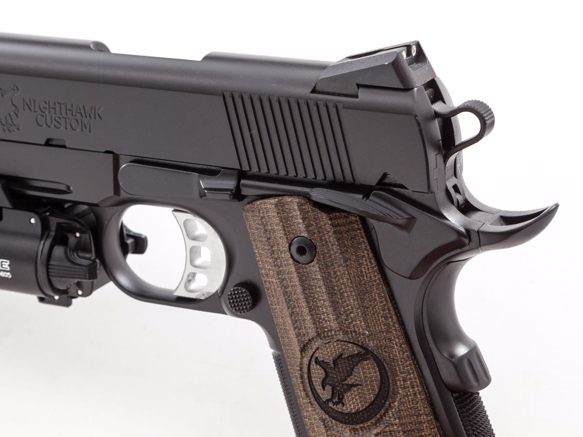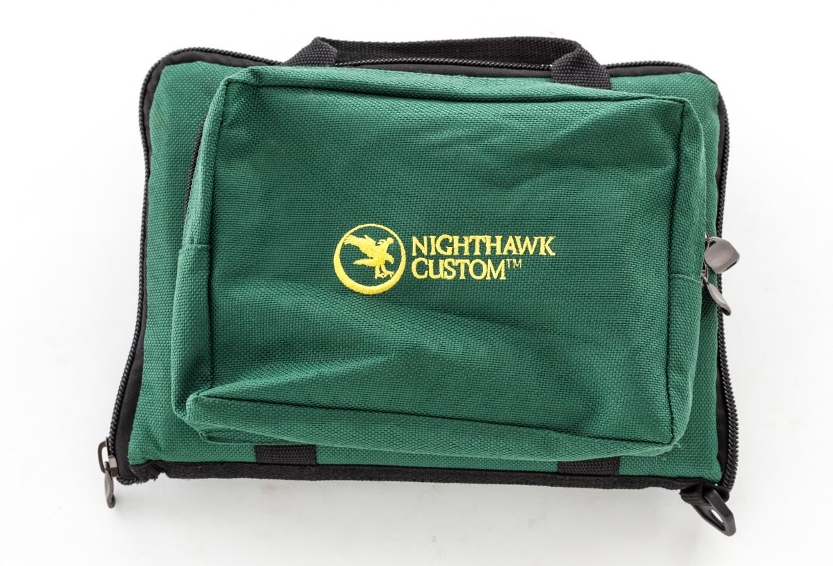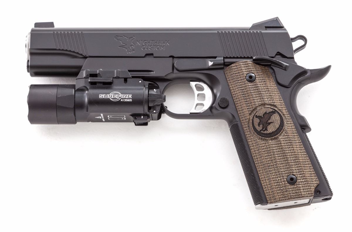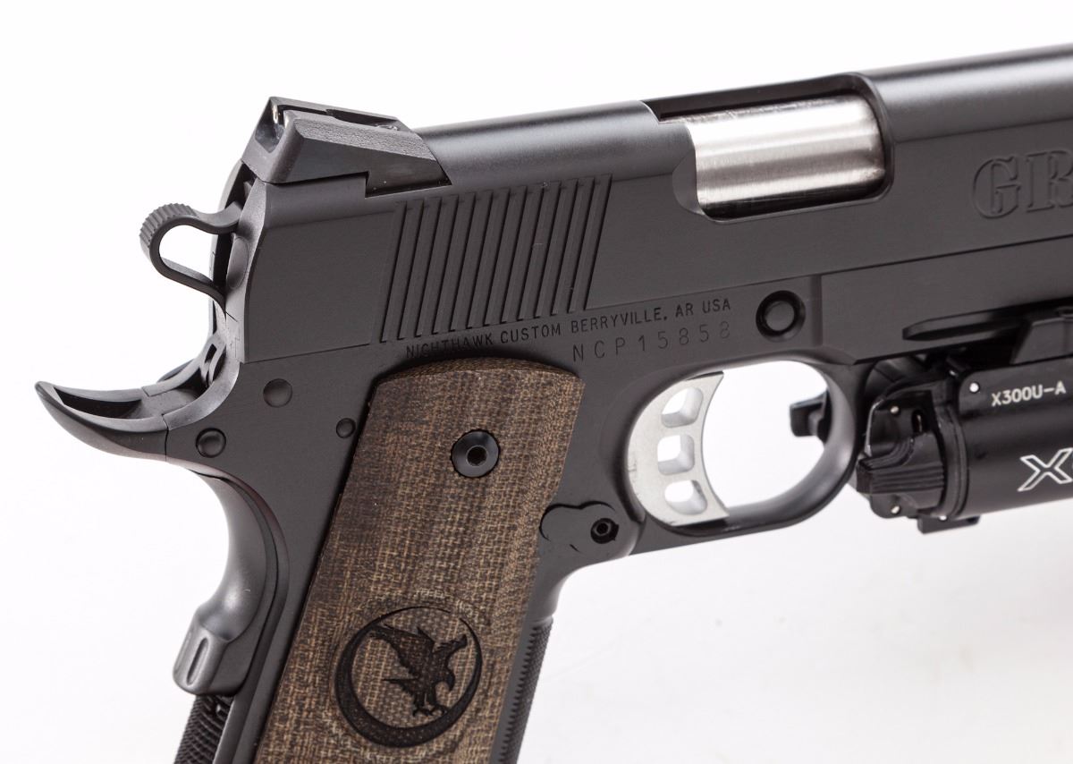 Nighthawk Custom GRP (Global Response) Semi-Automatic Pistol, #NCP15858, .45 ACP cal., 5'' Match barrel, black Permakote ceramic base finish, green micarta grips, checkered front and back grip strap, thumb safety, beavertail grip safety, aluminum trigger, bobbed hammer, Trijicon night sights, lower accessory rail with Surefire X300 Ultra tactical light, with one factory Nighthawk 8-round magazine, in original padded canvas case with owner's manual for both the pistol and Surefire light. External condition is excellent, appearing near new. Bore is near new showing signs of minimal use. Est.: $2,250-$3,000. (Modern/PPT)