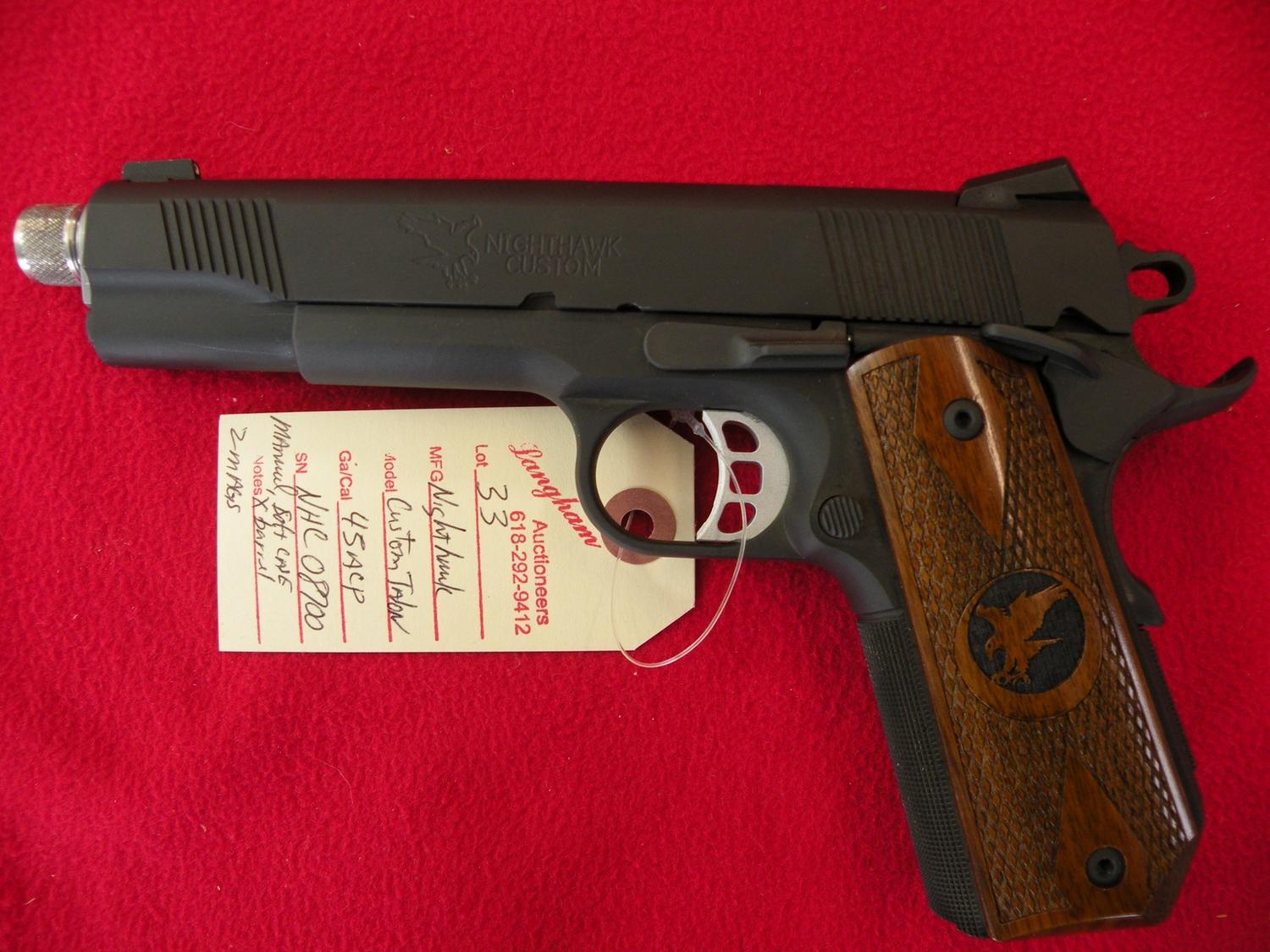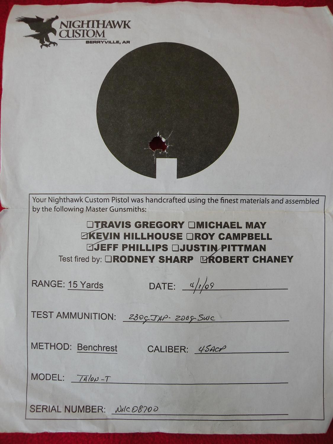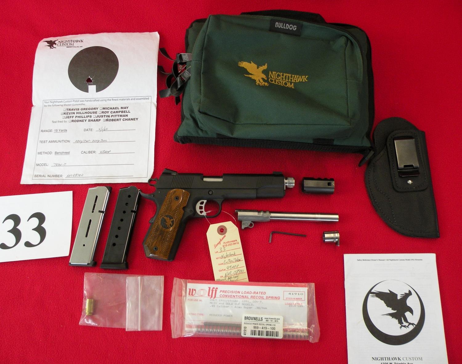 Trijicon Night Sights, SLM Barrel threaded 575X40, Muzzle Brake, Extra Long Match Barrel Can Be Theaded to your Specs, Reduced Recoil Spring, Nighthawk Custom Softcase, Spent Shell From Factory, Test Fire Target From Factory, Pistol is Bobtailed, Has Tapered Mag Well, And 2 Mags. Over $3800 Invested (Base Gun Now $2700). Very Nice High Dollar Accurate 1911, SN NHL 08700