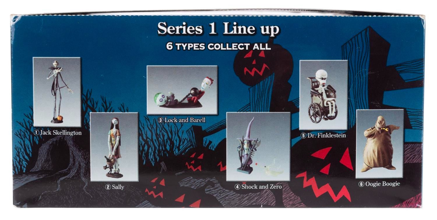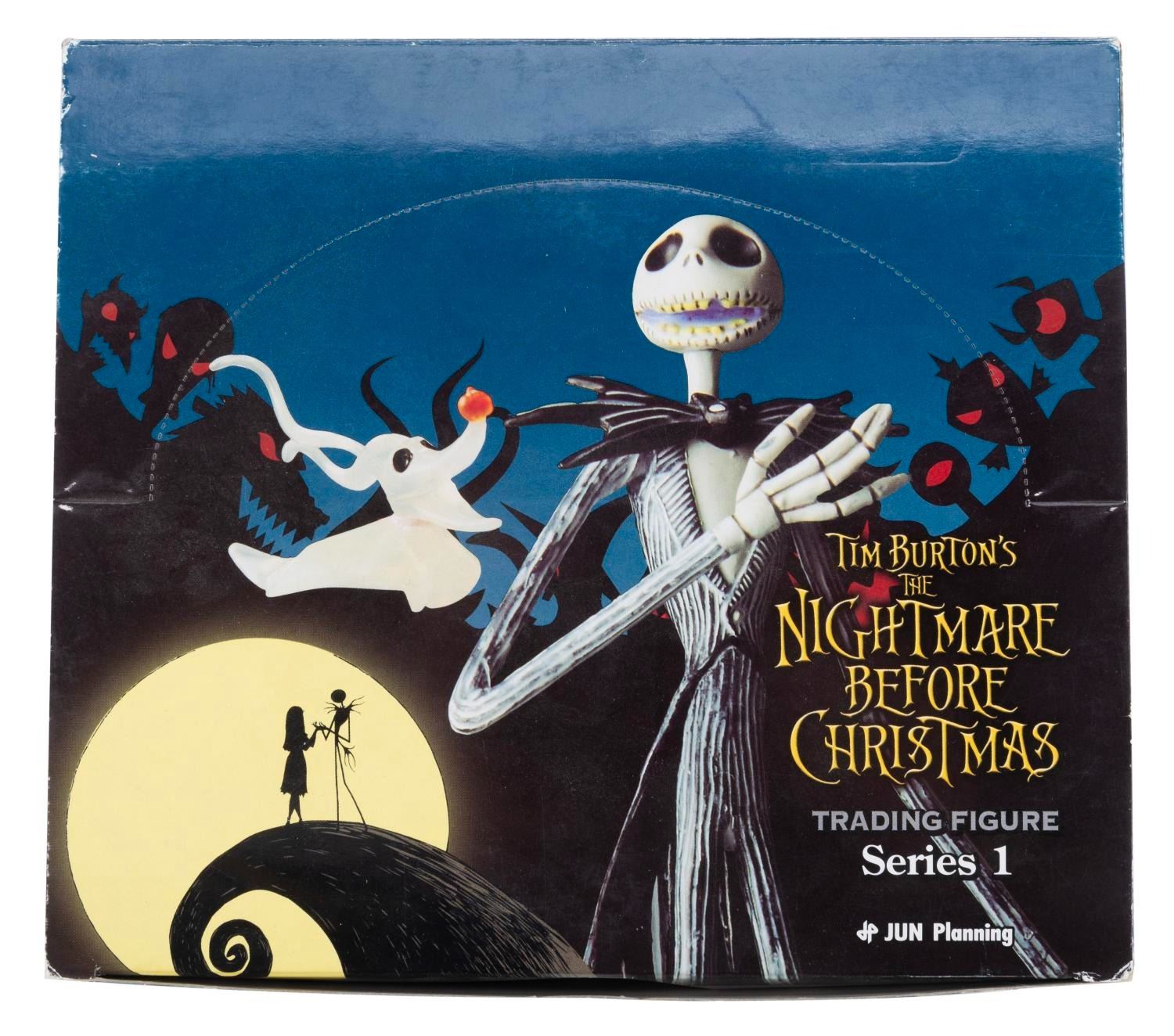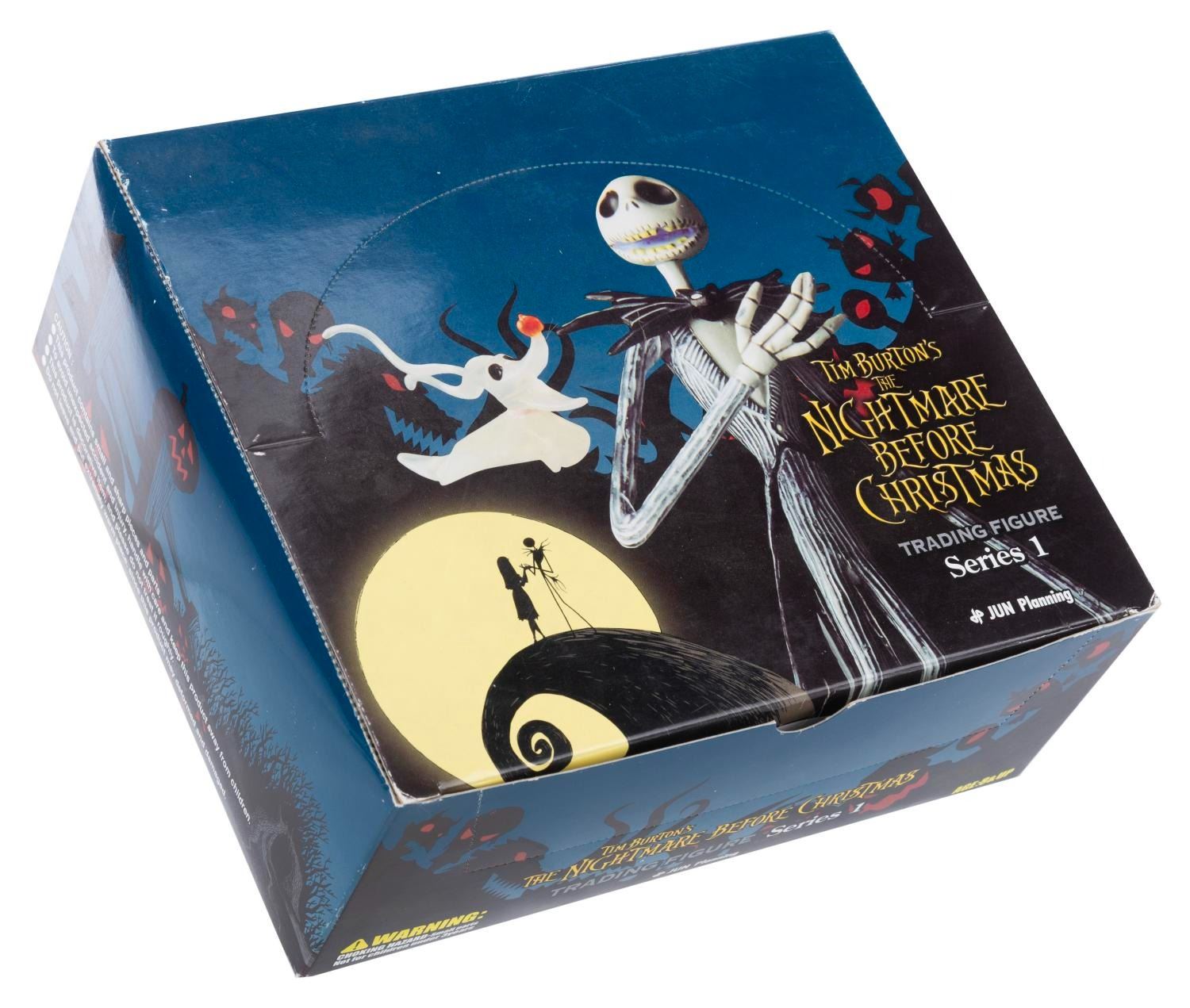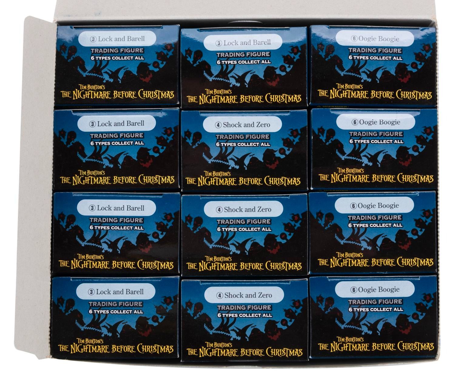 (Jun Planning, 2000s) A Series 1 trading figure set of 12 “Tim Burton’s The Nightmare Before Christmas” figures, with the countertop display box. Of the six possible figures in the line, included are five of “Lock and Barrel,” three of “Shock and Zero,” and four of “Oogie Boogie.” Measuring 7.5” x 8.5” x 3.5” tall, the display box is in very good condition with light wear to the edges and the top. The 12-figure boxes are in fine unopened condition.
