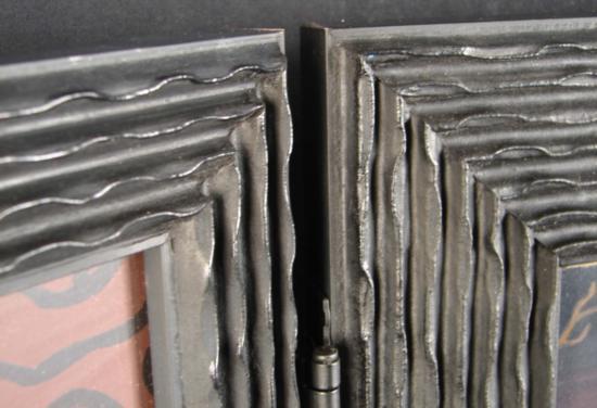The frame really sets the piece apart. It is a black-matte, hinged frame with raised relief grooves. It can be hung on the wall, or nicely displayed on a tabletop or mantle.