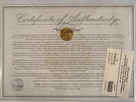 This is a limited-edition giclée on paper, framed triptych depicting three key scenes from the Touchstone stop-animation feature, Tim Burton's The Nightmare Before Christmas. This edition, "Trick or Tree" recreates Sequence 101 (left panel), Sequence 407 (center panel), and Sequence 206 (right panel) featuring Jack Skellington, his love-lorn rag doll friend Sally and an assortment of Halloweentown's dark denizens.