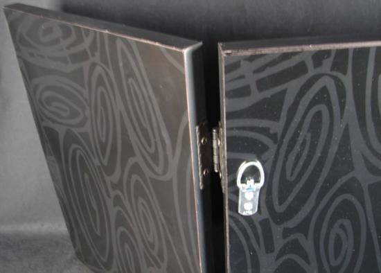 The frame really sets the piece apart. It is a black-matte, hinged frame with raised relief grooves. It can be hung on the wall, or nicely displayed on a tabletop or mantle.