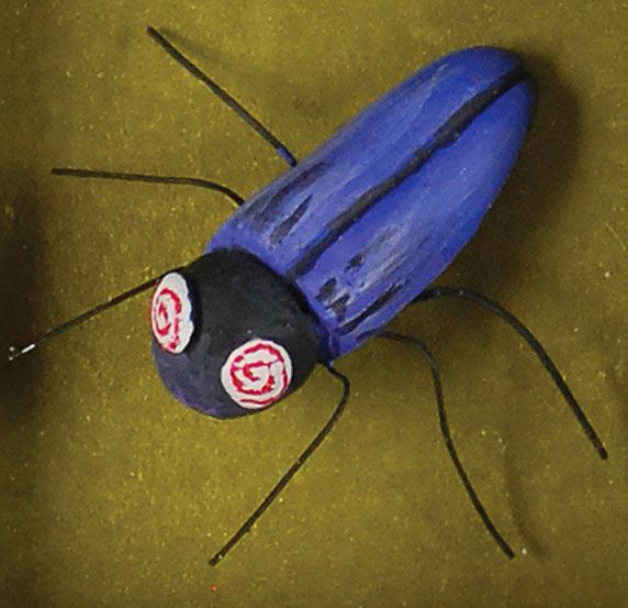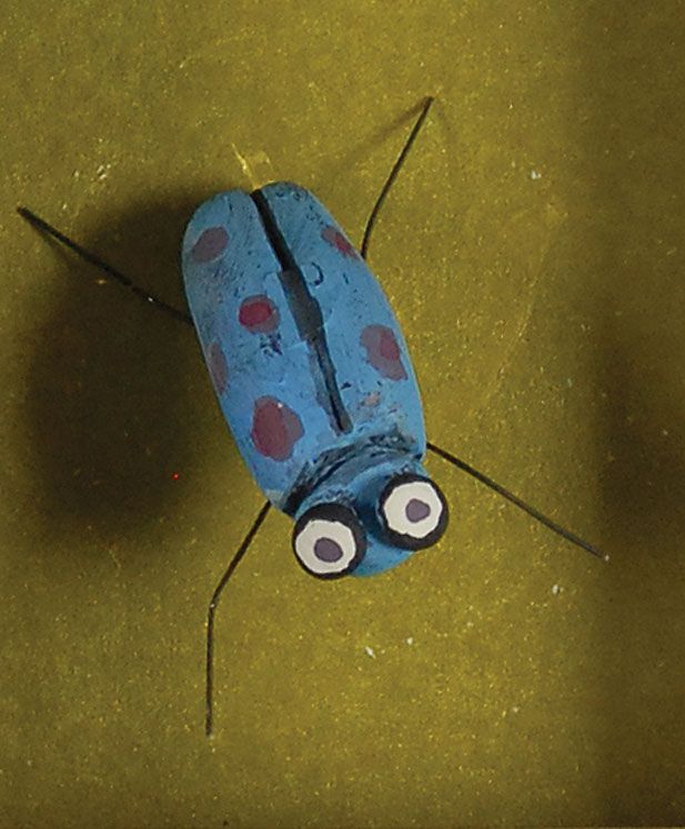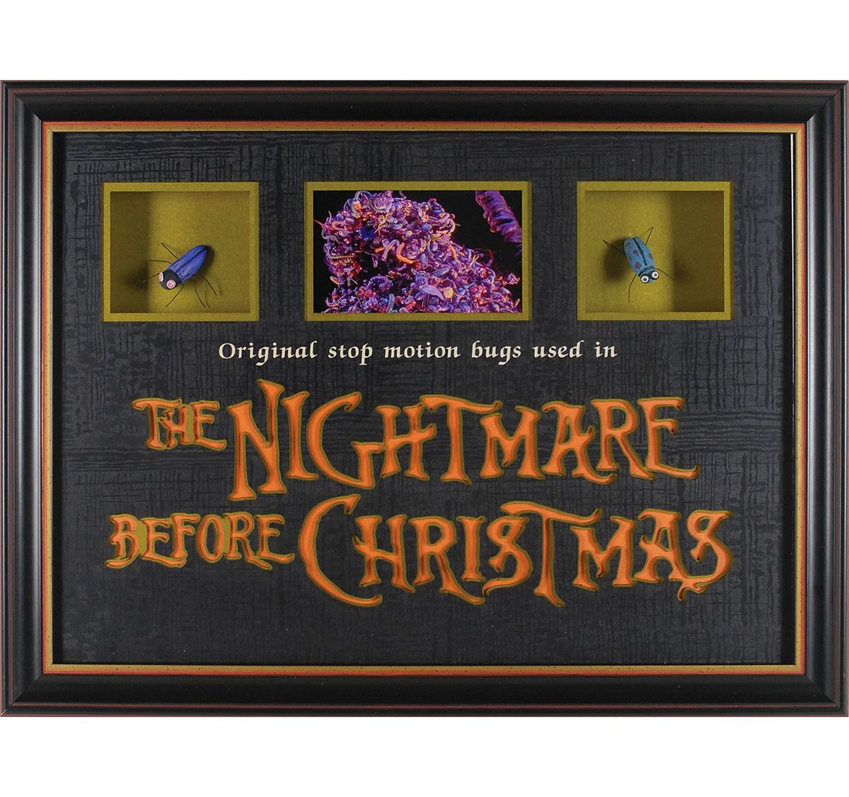 Two screen-used hand-painted stop-motion bugs used in the 2000 Tim Burton film The Nightmare Before Christmas. Each bug measures approximately 1.5? long, one with four legs and one with six legs and crazy spiral eyes. These bugs were used in the final Oogie Boogie death scene as bugs poor out of his body. Both are shadow-boxed and framed together to an overall size of 19 x 14. In fine condition.