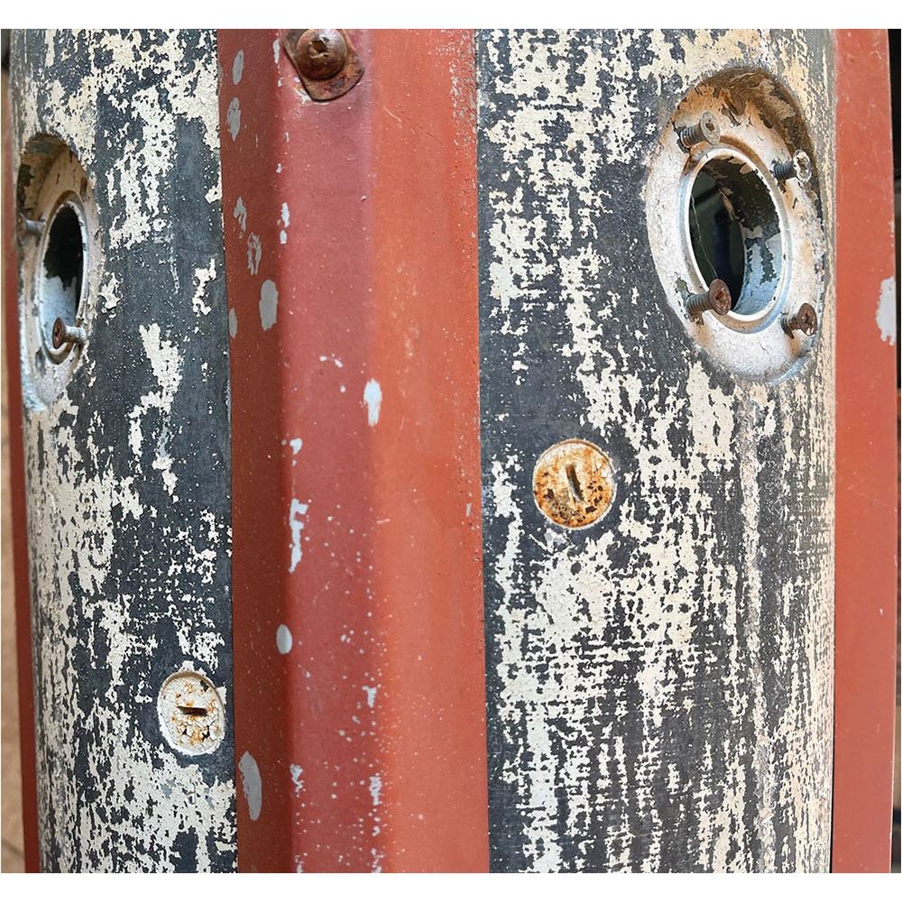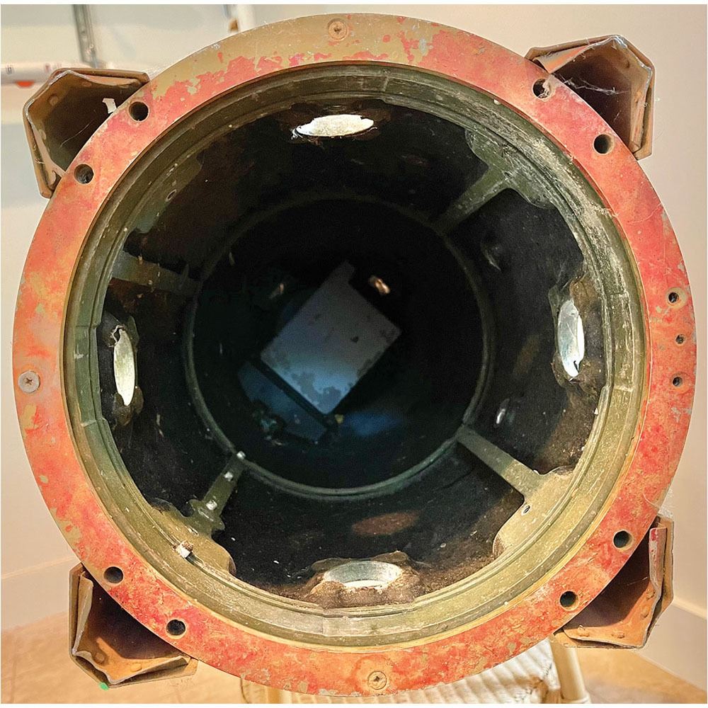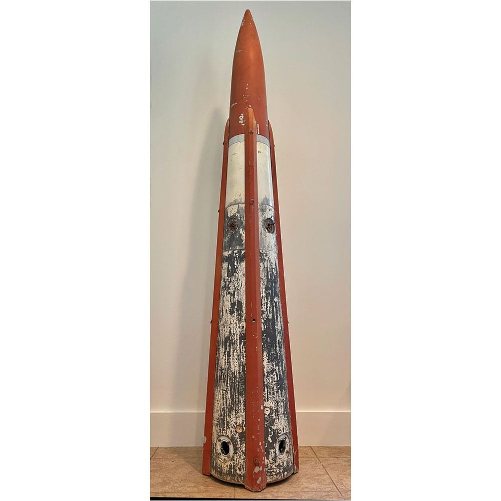 Rare Nike Ajax missile nosecone, measuring 6‰Ûª 3‰Û tall and 14‰Û across at the base's widest point (rib to rib), and weighing approximately 51 lbs. The circular ports on the sides are brackets for mounting the canard fins, which controlled the missile's flight path. The nosecone has a worn red-and-white paint finish.
