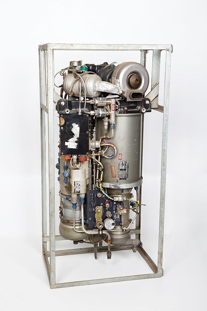 Nike Hercules Rocket/Missile Auxiliary Power Unit, mounted inside an 18? x 36? x 12? metal stand, with an Airesearch tag on the body, reading: "Power Unit, Turbine, Electric, Hydraulic, Part 550158, Model APU5-9-1, Serial 39-2194," noting its fuel as "Ethylene Oxide." Attached to the turbine are a Vickers "Hyd. Missile Pack" and "Accumulator Reservoir," as well as an Airesearch "Control Power Unit" and "Drive Unit Turbine Hydraulic." An inspection sticker dates the unit to "1Q59." In fine condition. Developed as a nuclear surface-to-air missile, the Nike Hercules was first deployed in 1958.