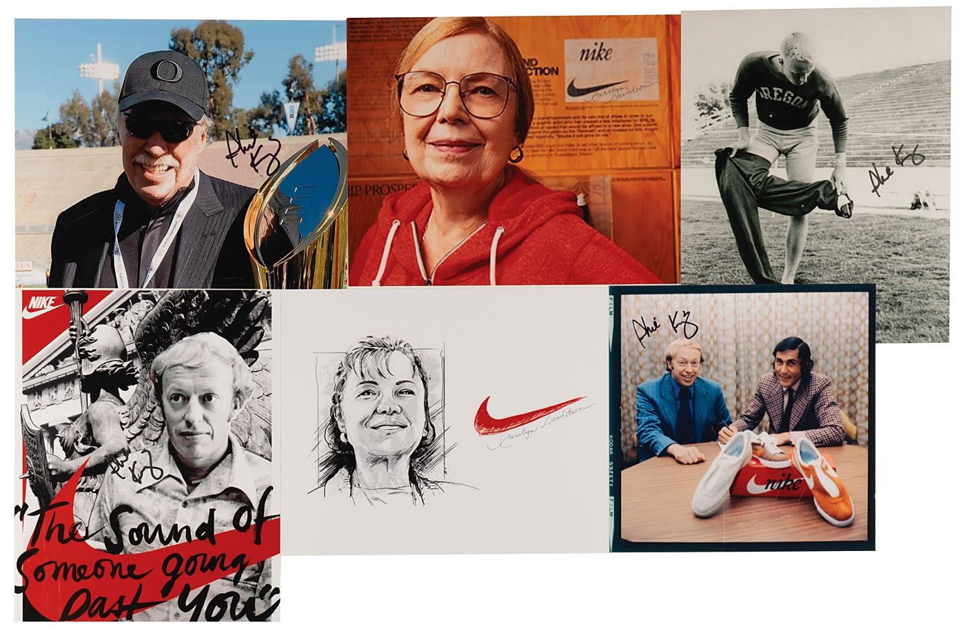 Group lot of six glossy photos, ranging in size from 8 x 8 to 10 x 8, with four signed in black felt tip by Nike cofounder Phil Knight, and two signed in black ballpoint by Carolyn Davidson, the creator of the Nike swoosh. In overall fine condition. Accompanied by a Nike business card belonging to Knight, and a personal business card belonging to Davidson, both of which are individually signed in black ink.