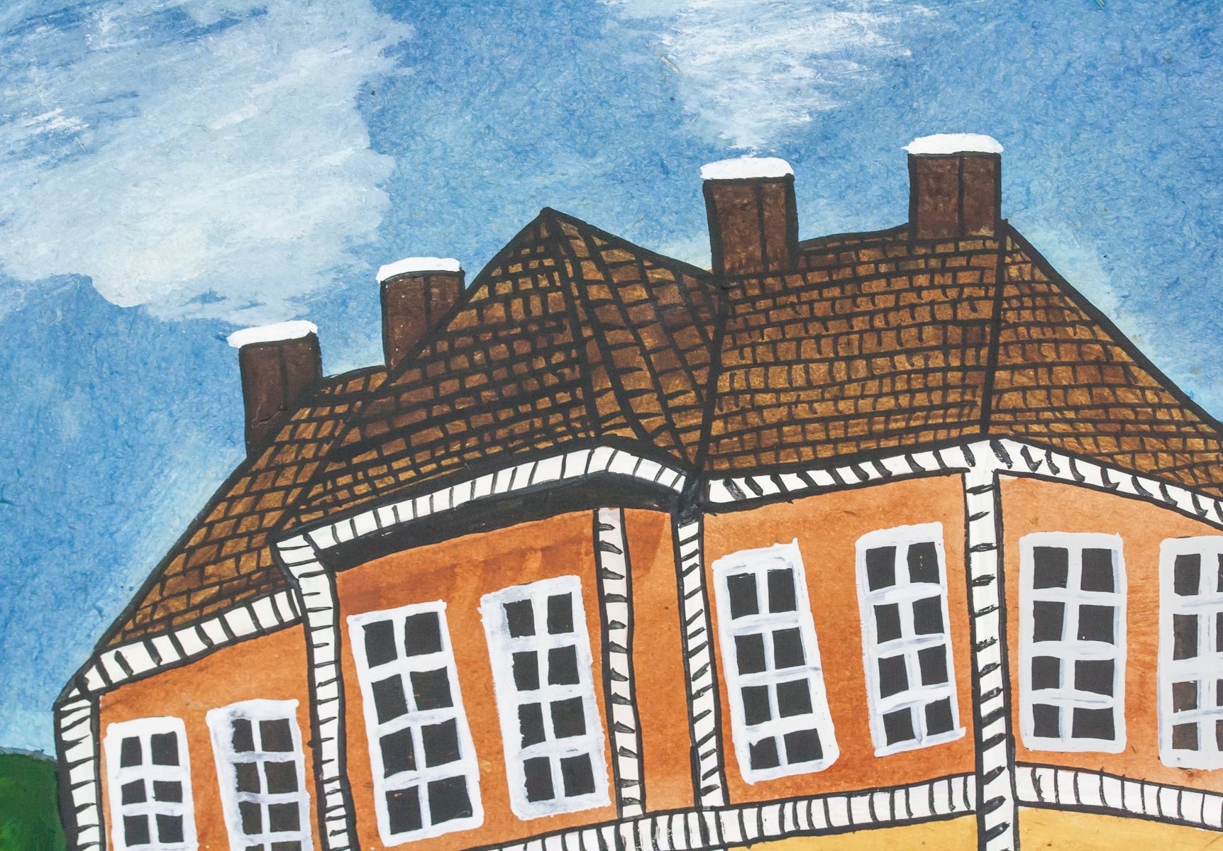 Mixed media on board. Featuring image of a large three-story house. Signed "NIKIFOR KRYNICASELD" across the bottom. Attributed to Nikifor Krynicki (1895-1968, Polish). 30 x 21 cm (11.75 x 8.5 inches)