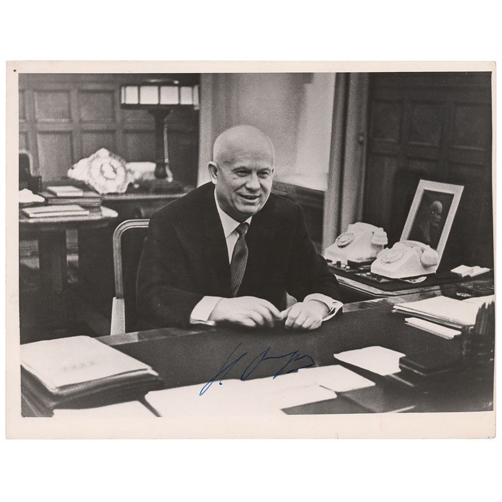 Scarce glossy 9.25 x 7.25 photo of Nikita Khrushchev smiling from behind his desk, signed in blue ink, "N. Khrushchev." In fine condition, with scattered light creasing.