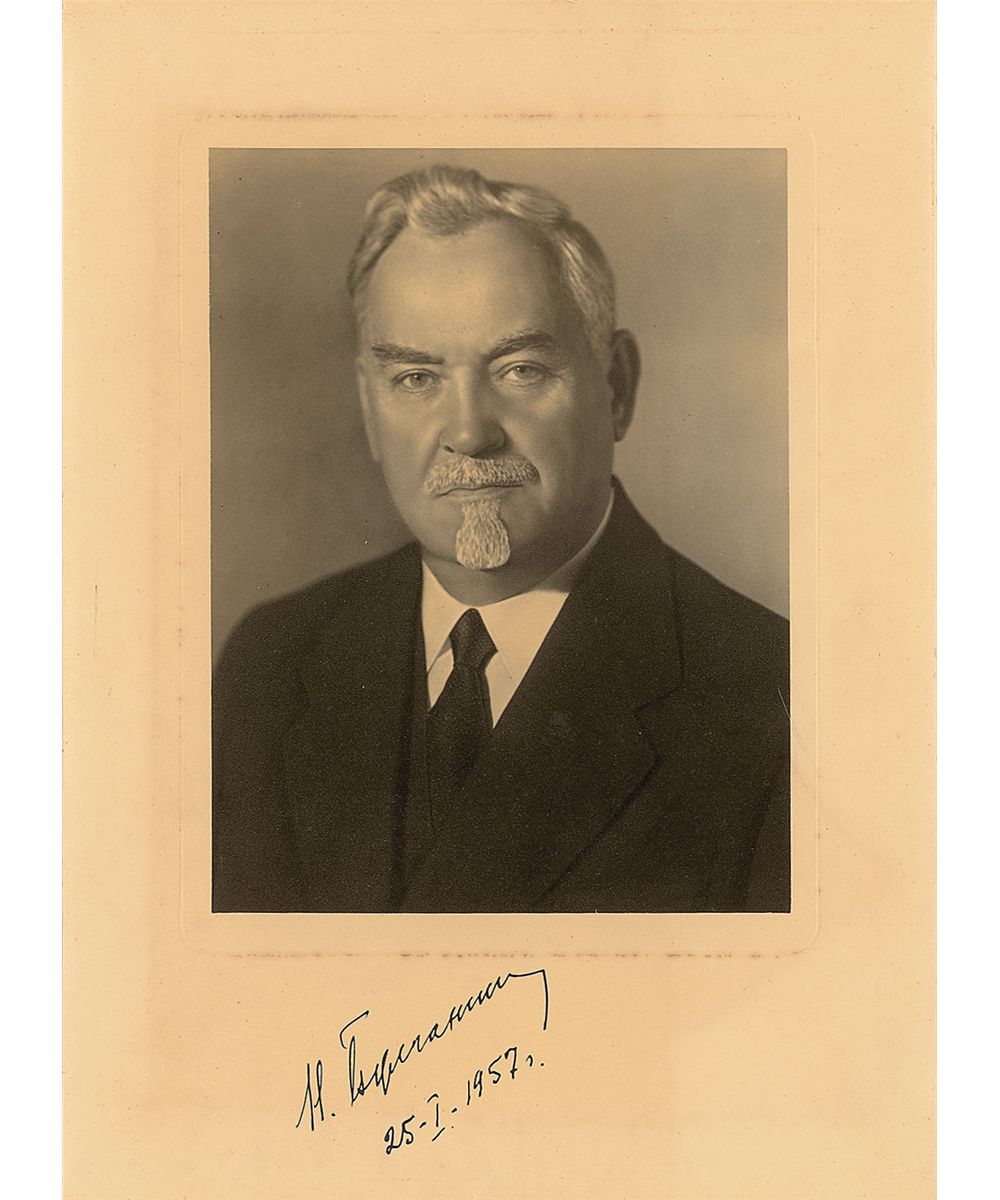 Rare signed photos: vintage matte-finish 6.5 x 8.5 portrait of Khrushchev in a suit and tie, signed in the lower right in black ink, adding the date of November 30, 1957; and a vintage matte-finish 8 x 10.75 portrait of Bulganin in a suit and tie, signed in the lower border in black ink, adding the date of January 1, 1957. Khrushchev photo has a triangular area of discoloration to the upper left corner, moderate contrast to signature against his dark suit, and some silvering to dark areas of the image, otherwise fine condition; Bulganin photo in fine condition with some slight foxing and edge creases. Accompanied by original mailing envelopes for both and a secretary’s transmittal letter for the Khrushchev photo, sent to an artist in India who requested it through the embassy. Khrushchev is rare in any form and this is just the second signed portrait we have offered—even more importantly, this photo dates to a turning point in Soviet foreign relations. Just 15 days prior to signing, on November 15, Khrushchev had given an interview in which he bragged about Soviet missile superiority over the US, saying, 'Let's have a peaceful rocket contest just like a rifle-shooting match, and they'll see for themselves.'