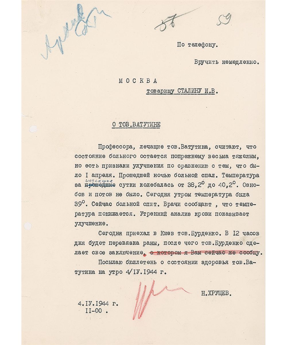 War-dated DS, signed in red pencil, in Russian, one page, 8 x 11.25, April 4, 1944. An update on the medical condition of General Vatutin sent to Joseph Stalin. In part: “The professors who are testing Comrade Vatutin think that the patient remains in very critical condition, but, in comparison to the state of things on April 1, there are signs of improvement…There were no chills or sweating…Right now the patient is sleeping. The doctors report that the fever is subsiding. The morning blood test shows improvement…The wound dressing will take place at 12 o’clock.” Expected document wear and a couple of small tears to left edge, otherwise fine condition. On February 28, 1944, Vatutin regrouped for a new operation and was heading to Slavuta when he was ambushed by the Ukrainian Insurgent Army far behind the front lines near the village of Mylyatyn in Ostroh Raion. He did not immediately die from his wounds and was taken to a hospital for treatment. This letter was written roughly two weeks before Vatutin would succumb to sepsis, resulting from his injuries.