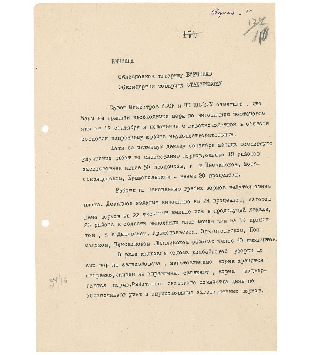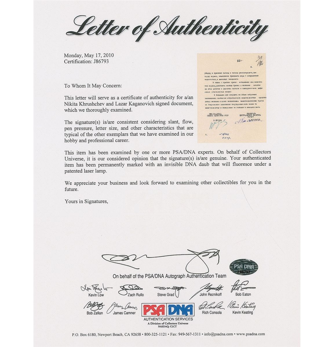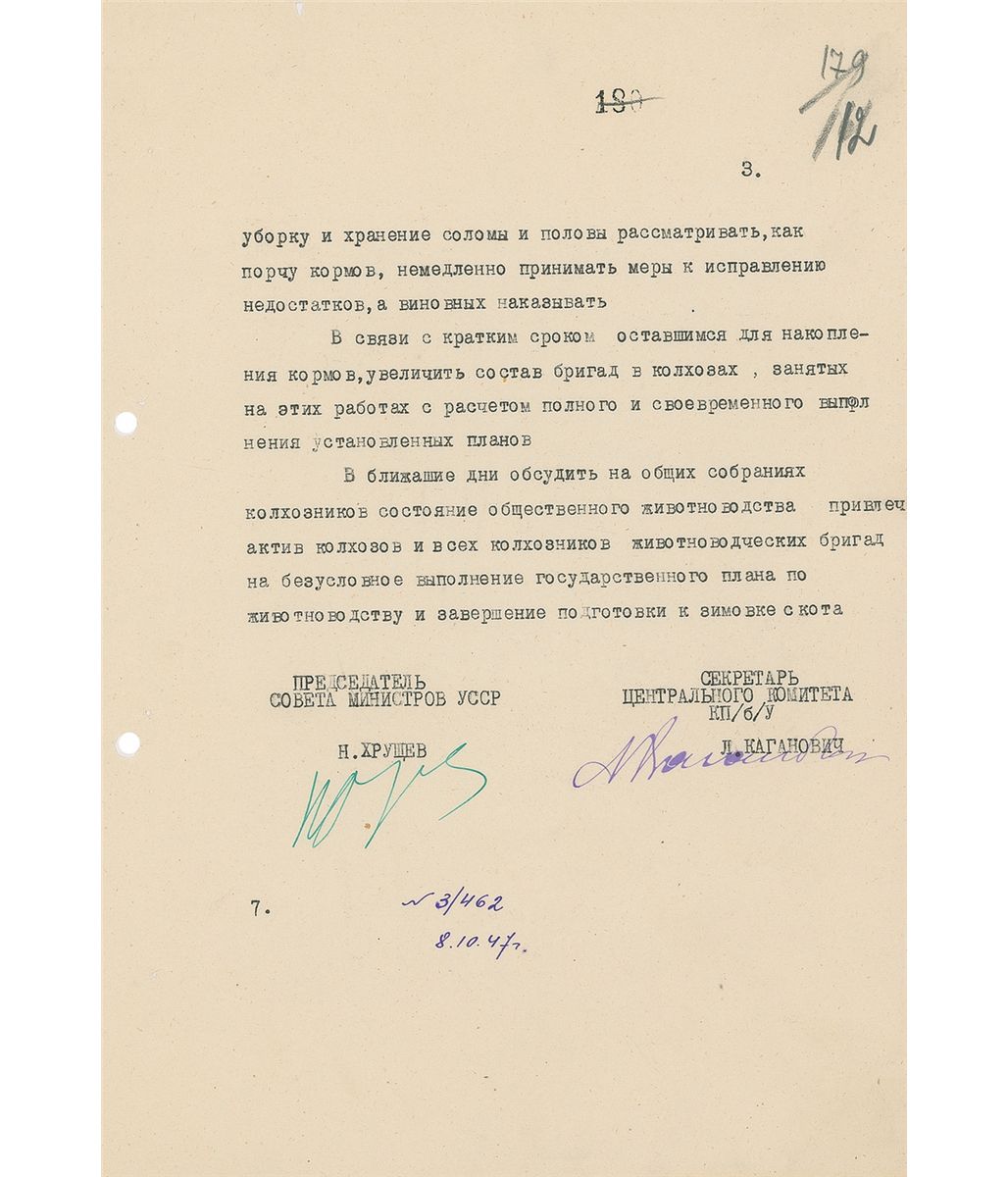 TLS in Cyrillic, signed “N. Khrushchev,” three pages, 8 x 11.25, no date. In part (translated): “There are some achievements…with fodder silage, but 13 regions put on silage less than 50%…straw after combine harvesting is not stacked, already stored fodder is kept carelessly, stacks are not in a proper condition…and as a result—fodder spoils. Regional agricultural departments do not even provide accounting for stocked fodder…Pay special attention for opportune harvest of corn stalks, sugar beet tops and other cultivation waste as cattle fodder…negligence during harvesting and keeping of straw must be considered as fodder damage and those persons who are guilty must be punished immediately.” Signed at the conclusion by Khrushchev as chief council of ministers, and countersigned by Lazar Kaganovich as secretary of party central committee of Ukraine. In fine condition, with filing holes to left side and various office notations. Accompanied by a full letter of authenticity from PSA/DNA.