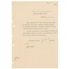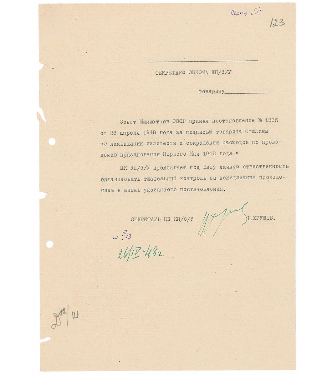 DS in Cyrillic, signed “N. Khrushchev,” one page, 8 x 11.25, April 26, 1948. Document issued to the Secretary of the Regional Committee of the Communist Party of Ukraine, ordering that he reduce expenses in connection with the celebration of May Day. In full (translated): “The USSR Council of Ministers adopted resolution No. 1335 on April 26, 1948, for the signature of Comrade Stalin, which is entitled 'On the Elimination of Extravagances and the Reduction of Expenditures for Holding the 1948 May Day Celebration.' The Central Committee (CC) of the CP(b)U proposes that you take personal responsibility for organizing the close monitoring of the subject resolution’s immediate implementation.” In fine condition, with central vertical and horizontal folds, scattered creases, filing holes and small tears to left edge, and general expected document wear.