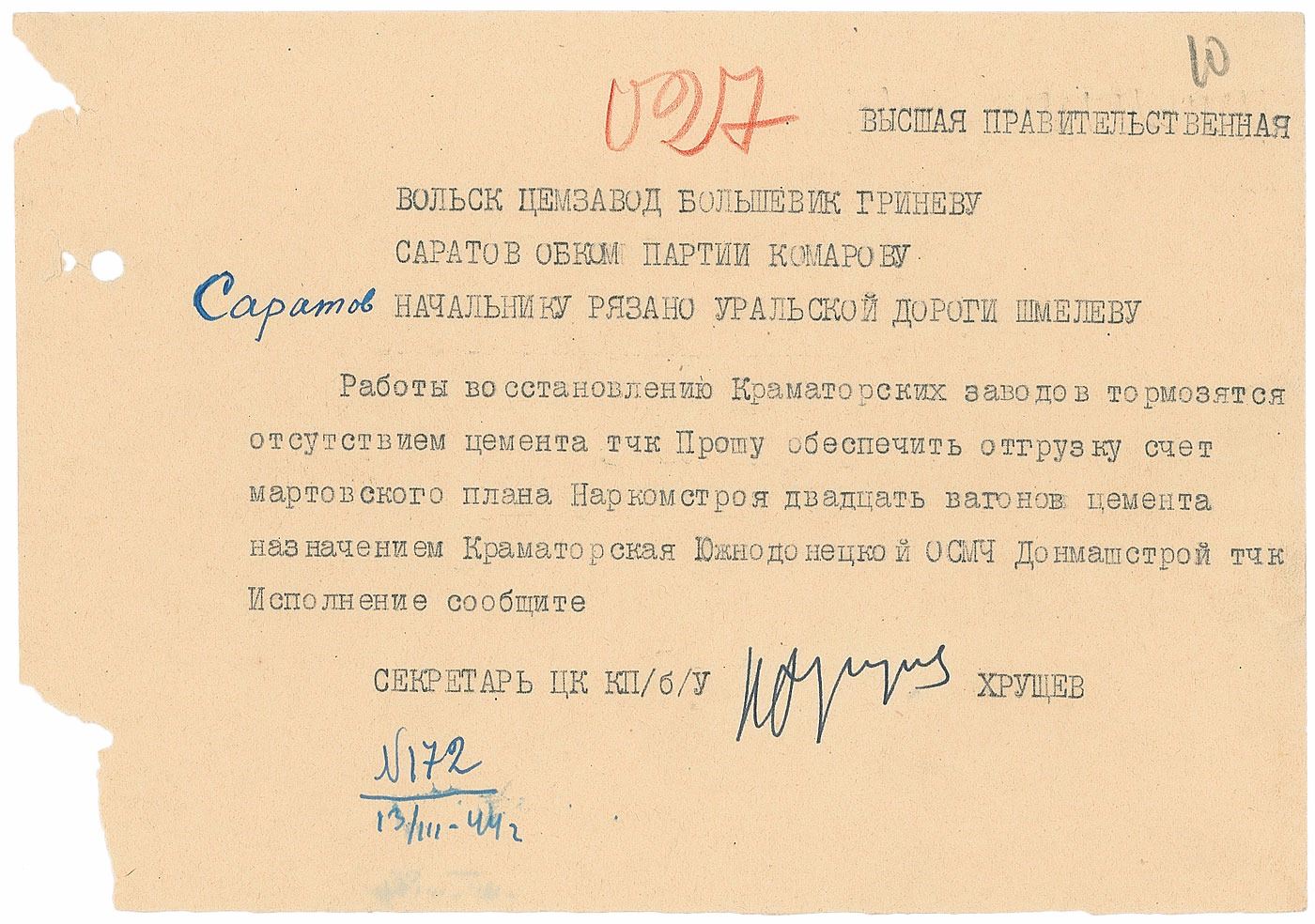 DS in Cyrillic, signed “N. S. Khrushchev,” one page, 8 x 5.5, March 13, 1944. A typed governmental telegram. In part (translated): “A shortage of cement is delaying the work associated with the reconstruction of the Kramatorsk plants. I request that you ensure the shipment of the Narkomstroy March plan figure of twenty carloads of cement, destination Yuzhnodonetsk railroad Kramatorsk station, recipient Donmashstroy OSMCh. Advise of execution.” Expected document wear and paper loss to the left edge, otherwise fine condition.