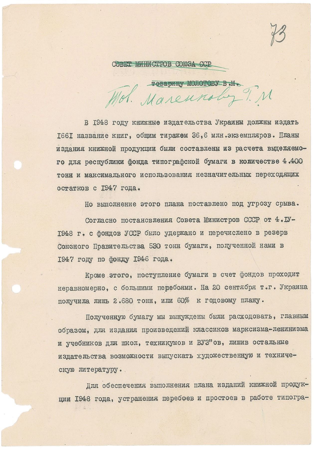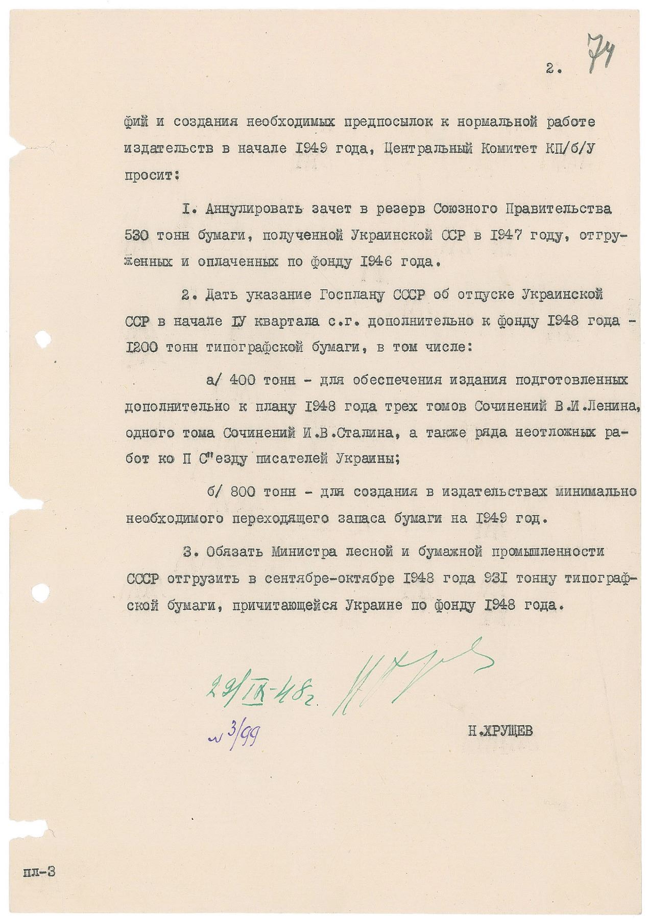 TLS in Cyrillic, signed "N. Khrushchev," two pages, 8 x 11.25, September 29, 1948. Letter to Comrade G. M. Malenkov, in part (translated): "In 1948, Ukrainian book publishing houses must release 1,661 book titles, with a total printing of 36.6 million copies. The book product publishing plans were prepared on the basis of a printing paper stock allocation for the republic in the amount of 4,400 tons and the maximum use of insignificant carryovers from 1947. But the fulfillment of this plan is threatened with failure. According to a resolution of the USSR Council of Ministers…530 tons of paper that we obtained in 1947 from the 1946 stock has been withheld and transferred to the Union Government reserve. In addition, the receipt of paper towards stock is taking place erratically, with long interruptions…We have been forced to use the paper received, primarily to publish classical works of Marxism-Leninism, as well as textbooks for schools, junior colleges, and institutions of higher learning, thereby depriving other publishing houses of the ability to release artistic and technical literature. In order to ensure the fulfillment of the plan for book product publications in 1948, eliminate interruptions and standstills in the operation of printing houses, and create the necessary prerequisites for normal publishing house operation in early 1949, the Central Committee of the CP(b)U hereby requests: 1. That the transfer of 530 tons of paper to the Union Government reserve that the Ukrainian SSR received in 1947, which was shipped and purchased for its 1946 stock, can be cancelled. 2. That instructions be issued to the USSR Gospian to ship 1,200 tons of printing paper to the Ukrainian SSR…to ensure the publication of three volumes of The Writings of V. I. Lenin and one volume of The Writings of I. V. Stalin, as well as a number of high-priority works for the 2nd Congress of Ukrainian Writers." Scattered creases and tears to filing holes on the left edge, otherwise fine condition. Accompanied by a full translation.