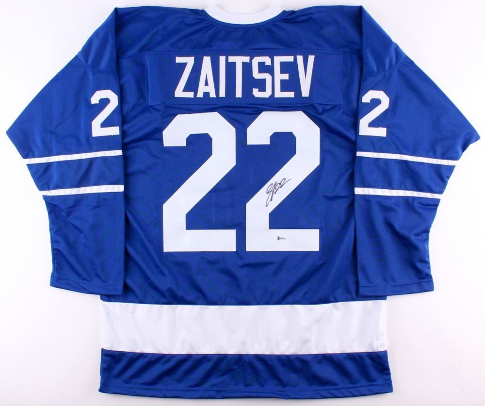 Custom on-ice style jersey. Everything sewn on, size XL. Hand-signed in black felt-tip pen by Nikita Zaitsev. The lot / autograph(s) includes an official Beckett Authentication Services serially numbered hologram and matching COA for authenticity purposes. Authentication: Beckett COA