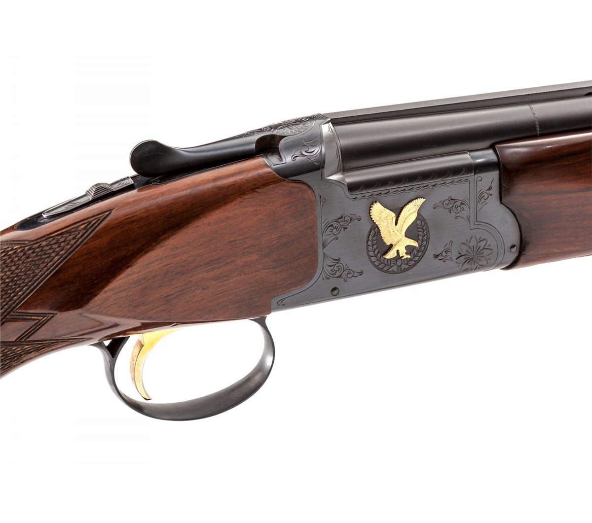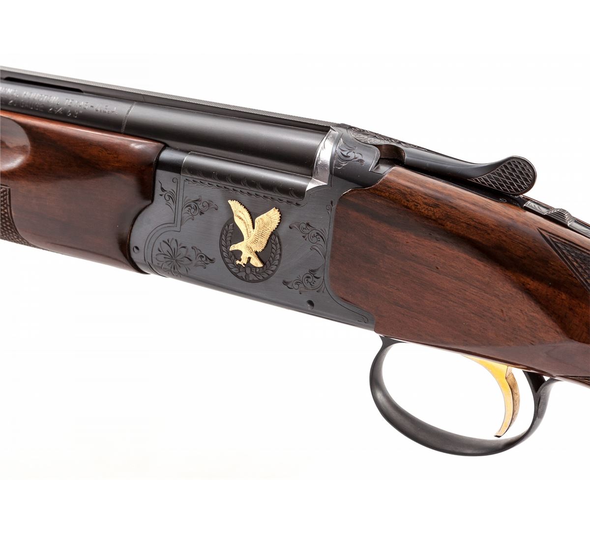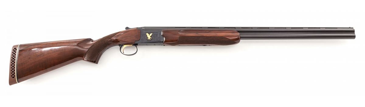 Nikko ''Golden Eagle'' Field Model 5000-II Over/Under Shotgun, #N257013, 20 ga., 3'' chs., polished blue finish, 26'' barrels with matted ventilated rib and front silver bead, choked Mod./IC., gold-plated trigger with manual sliding top tang safety and barrel selector, frame with overlaid gold toned eagle and wreath bordered by light scroll engraving; darkly streaked Claro walnut pistol grip stock and fingergroove forend with gloss finish, 14'' length of pull over red Pachmayr ventilated recoil pad. Overall condition is near excellent with tight lockup, bright bores and strong ejectors; barrels have 1'' of storage pitting in the finish 3'' from the muzzles with scattered handling marks in the rib and a small scuff near the recoil pad. Est.: $600-$900. (Modern)