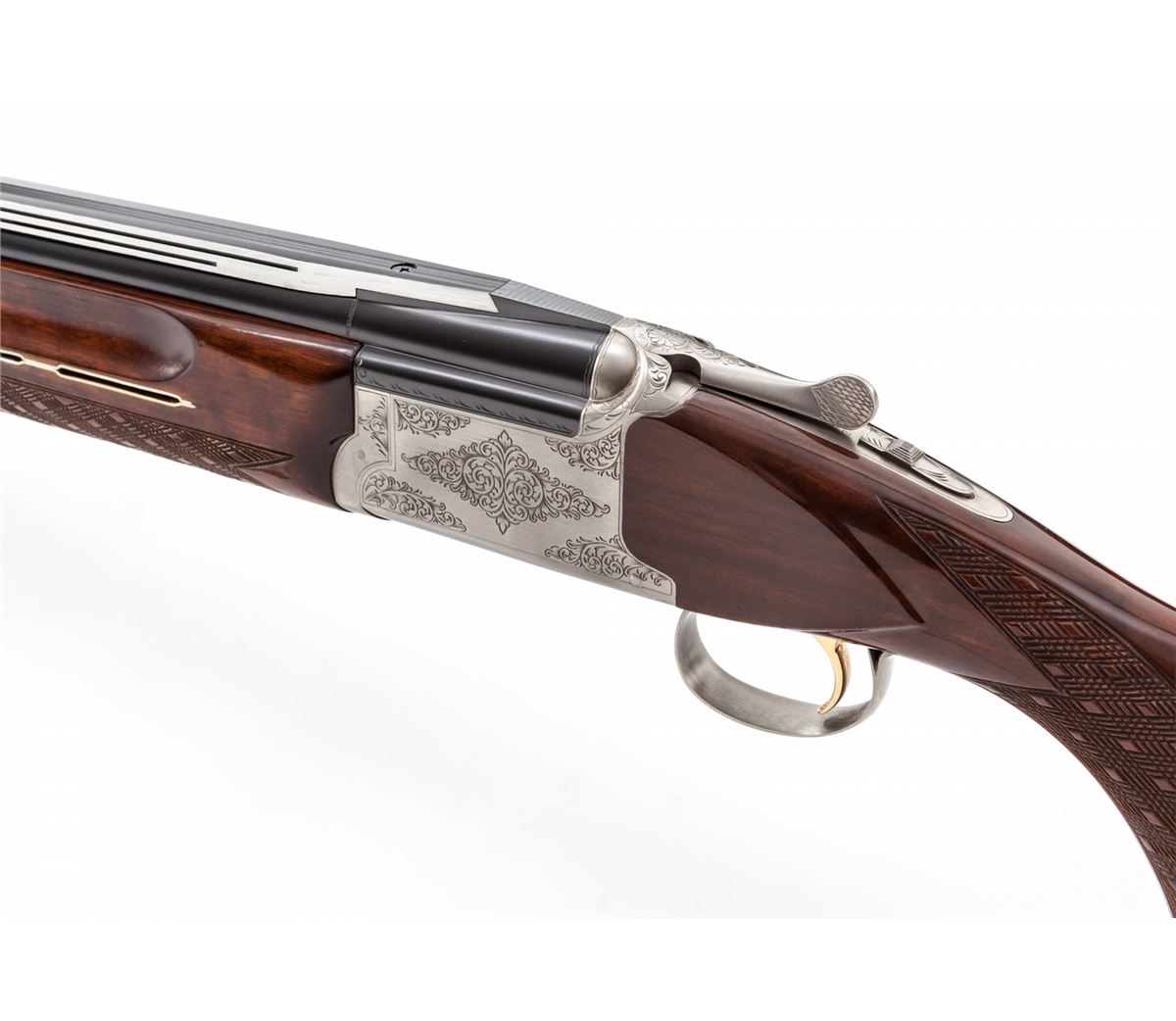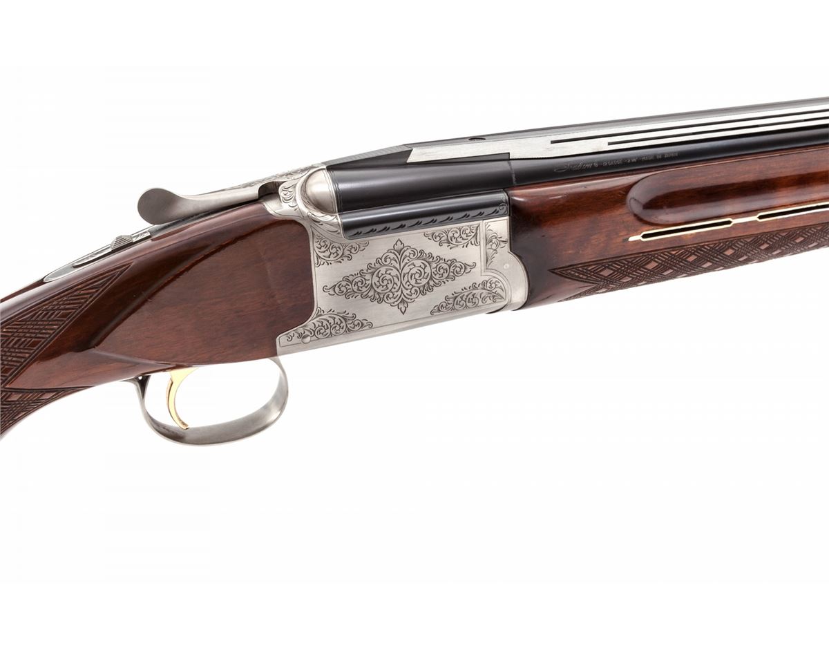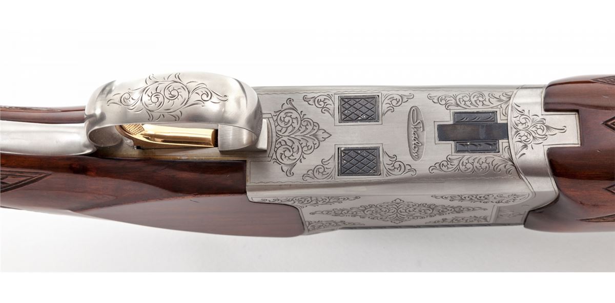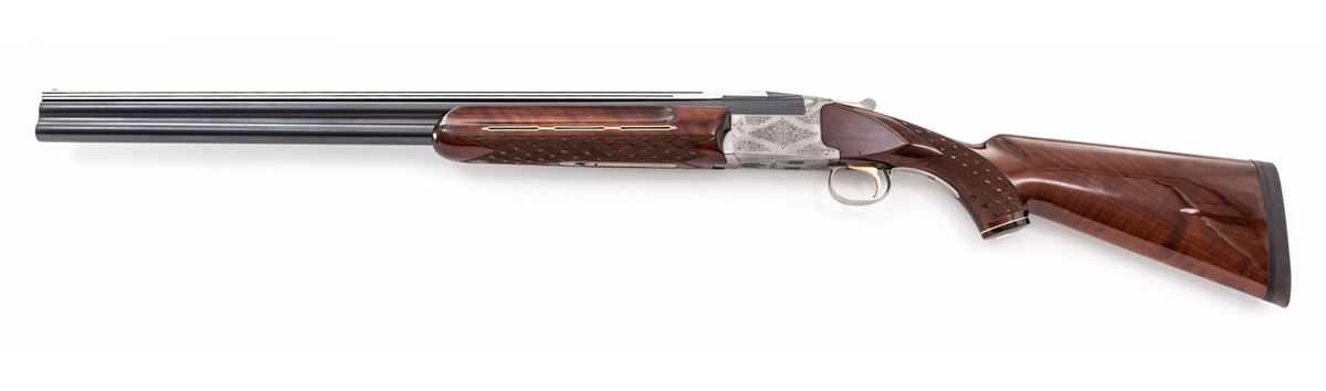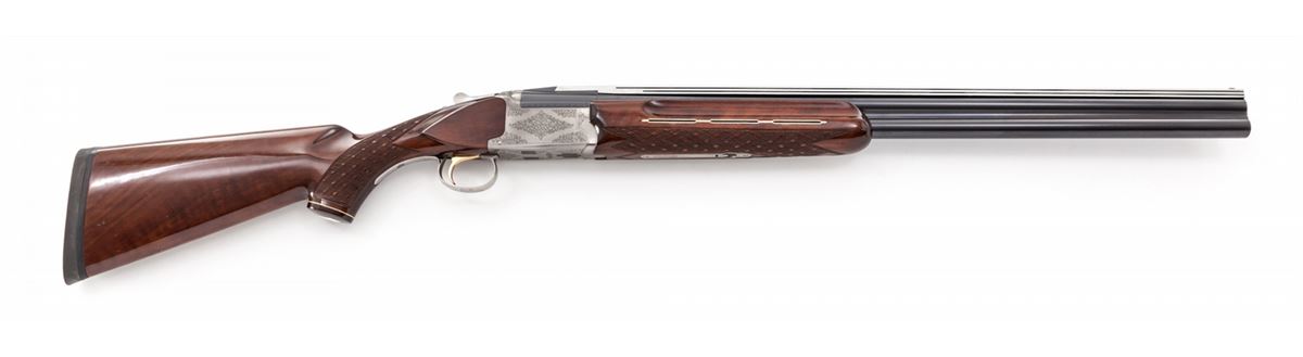 Nikko ''Shadow'' Over/Under Skeet Shotgun, #SK709782, 12 ga., 2-3/4'', 27-1/2'' blue finish barrels with matted 11/16'' ventilated aluminum rib, fixed Skeet chokes, front white and middle silver beads, gold-plated single trigger with manual sliding top tang safety and barrel selector, finely scroll engraved silver gray frame; high-gloss finish walnut stock and vented finger-groove target forend with skip-line checkering. Length of pull 14-1/2'' over a 3/4'' black Decelerator recoil pad, weight 7-3/4 lbs. Condition appears near new with minor storage marks on wood and a rack scuff in rib. Est.: $600-$800. (Modern)